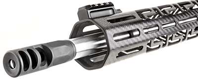 As with the lower receiver, the upper receiver is machined from 7075-T6 aluminum and finished with a MIL-A-8625, Type III Class 2 coating. Continuing the “adaptability” theme, the receiver’s top has an integral section to which a 0- or 20-m.o.a. Picatinny (Weaver-compatible) rail can be attached, and at the front of the 153⁄8"-long, free-floating carbon-fiber handguard is a 2" rail for the attachment of a front sight post. In addition to being aesthetically pleasing, the lightening/cooling cuts accept 2", 4" and 5" accessory rails, and at the six-o’clock position there are holes for the attachment of a sling swivel stud or QD sling mount.