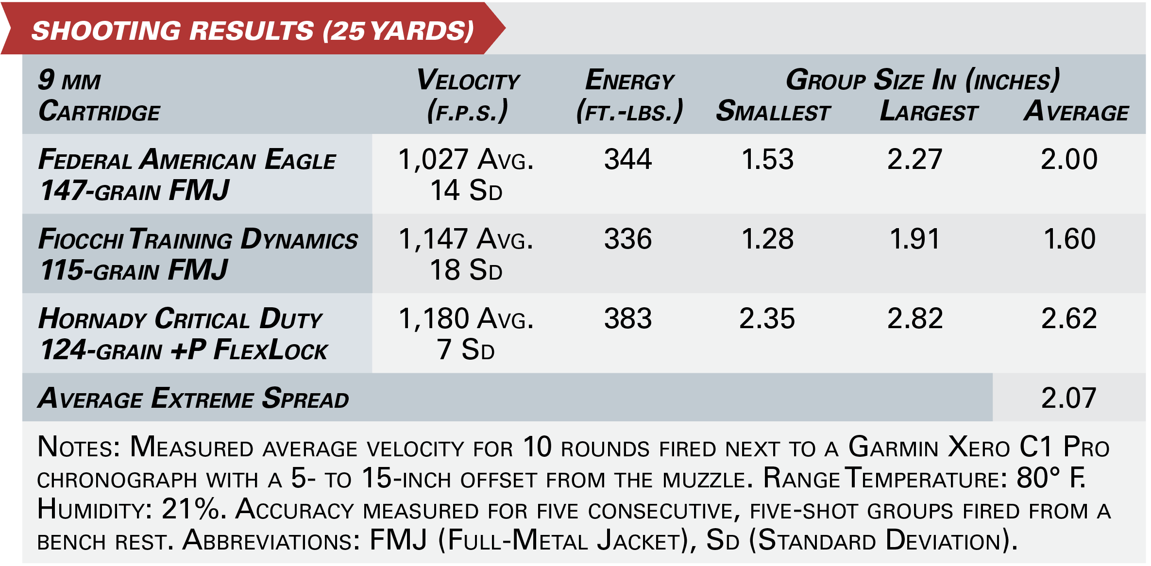 Formal performance testing was conducted by firing five, five-shot groups into paper targets posted at a distance of 25 yards. A Garmin Xero C1 Pro chronograph was used to measure the average muzzle velocities for 10-shot strings. The two practice-grade loads used included Federal American Eagle and Fiocchi USA Training Dynamics full-metal jacket offerings. Since some folks may choose to stage this pistol for personal protection, the test set was rounded out with Hornady's defense-grade Critical Duty 124-grain FlexLock +P load. Here are the results: