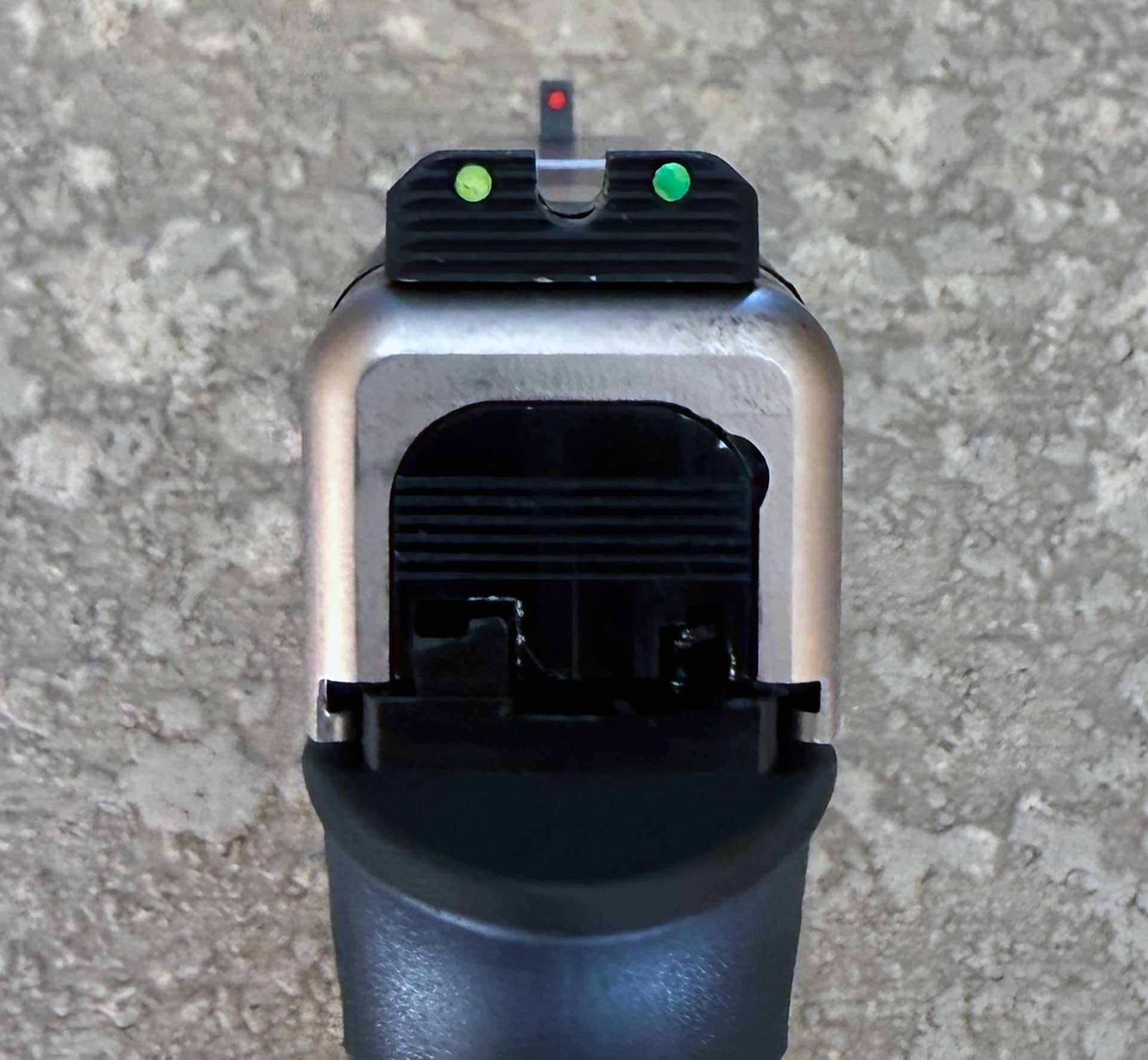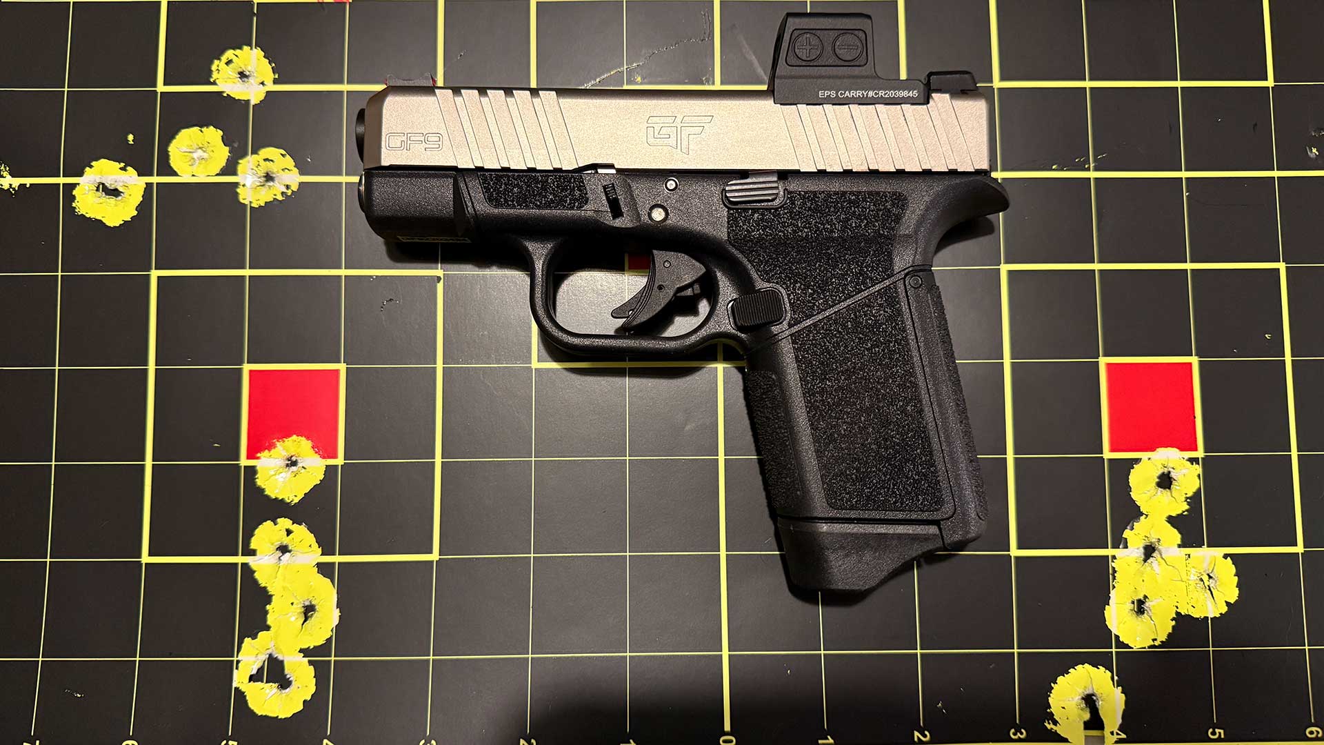 The steel front and rear sights contain red and green fiber-optic tubes. I have no qualms with the basic sights; they worked. The GF9 Rapture also comes factory-cut for an RMR or RMSc pattern optic. I chose to mount a Holosun EPS Carry with the RMSc cut, and it fit perfectly in place as it should with no plate needed. The problem arose when I tried to secure it to the slide. None of the screws included with the Holosun would work. Any other screw I tried was much too large in diameter.