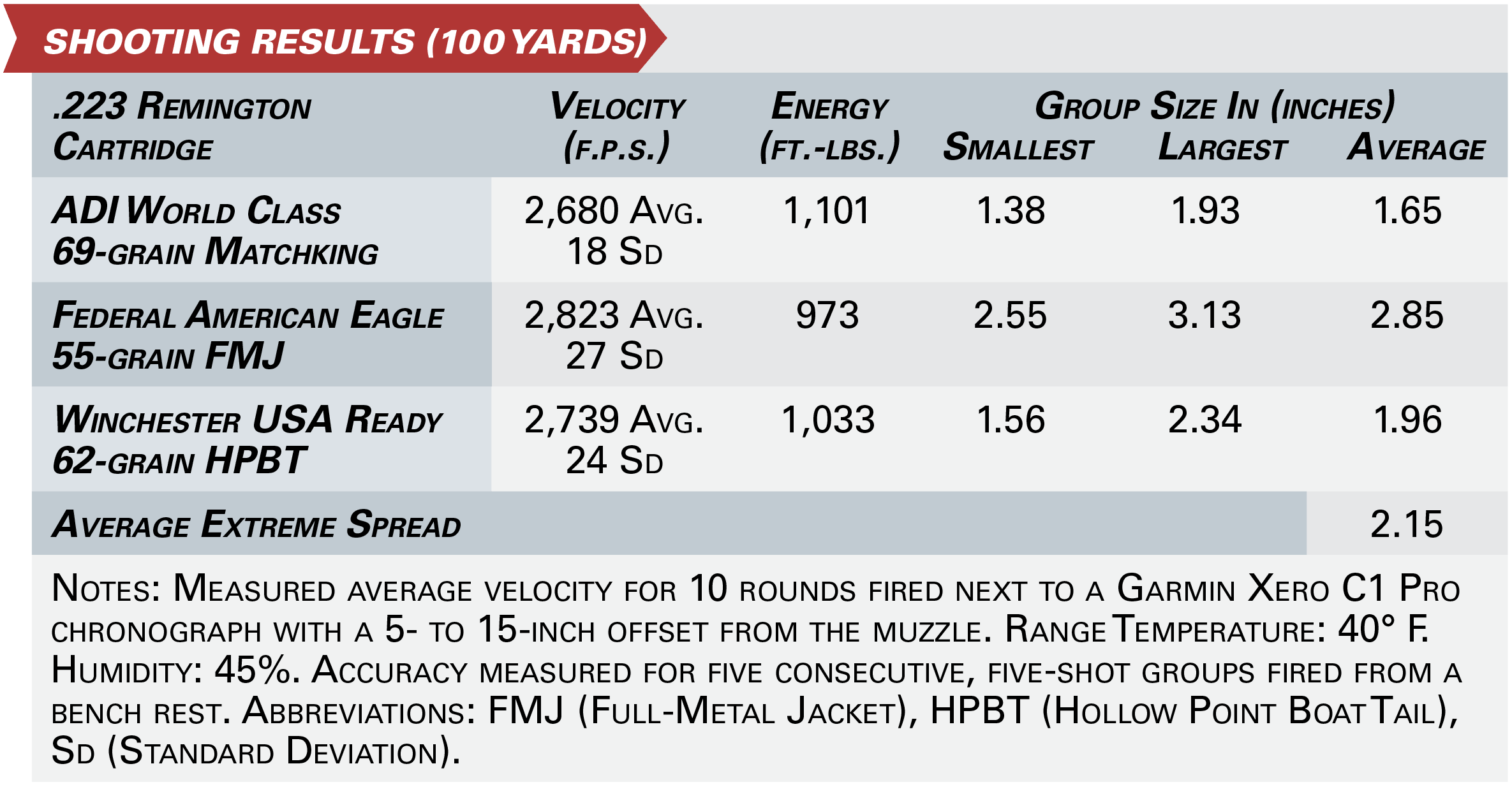 For the formal performance testing, five bench rested five-shot groups for three loads were fired into paper targets posted at a distance of 100 yards. A Garmin Xero C1 Pro chronograph was used to measure bullet muzzle velocity averages for 10-shot strings. The .223 Rem. ammunition used included ADI World Class rounds (imported by Global Ordnance) topped off with Sierra Bullet's 69-grain Match King open-tip match bullets, Federal Premium American Eagle 55-grain full-metal jacket loads and Winchester's USA Ready 62-grain open-tip match. Here are the results:
