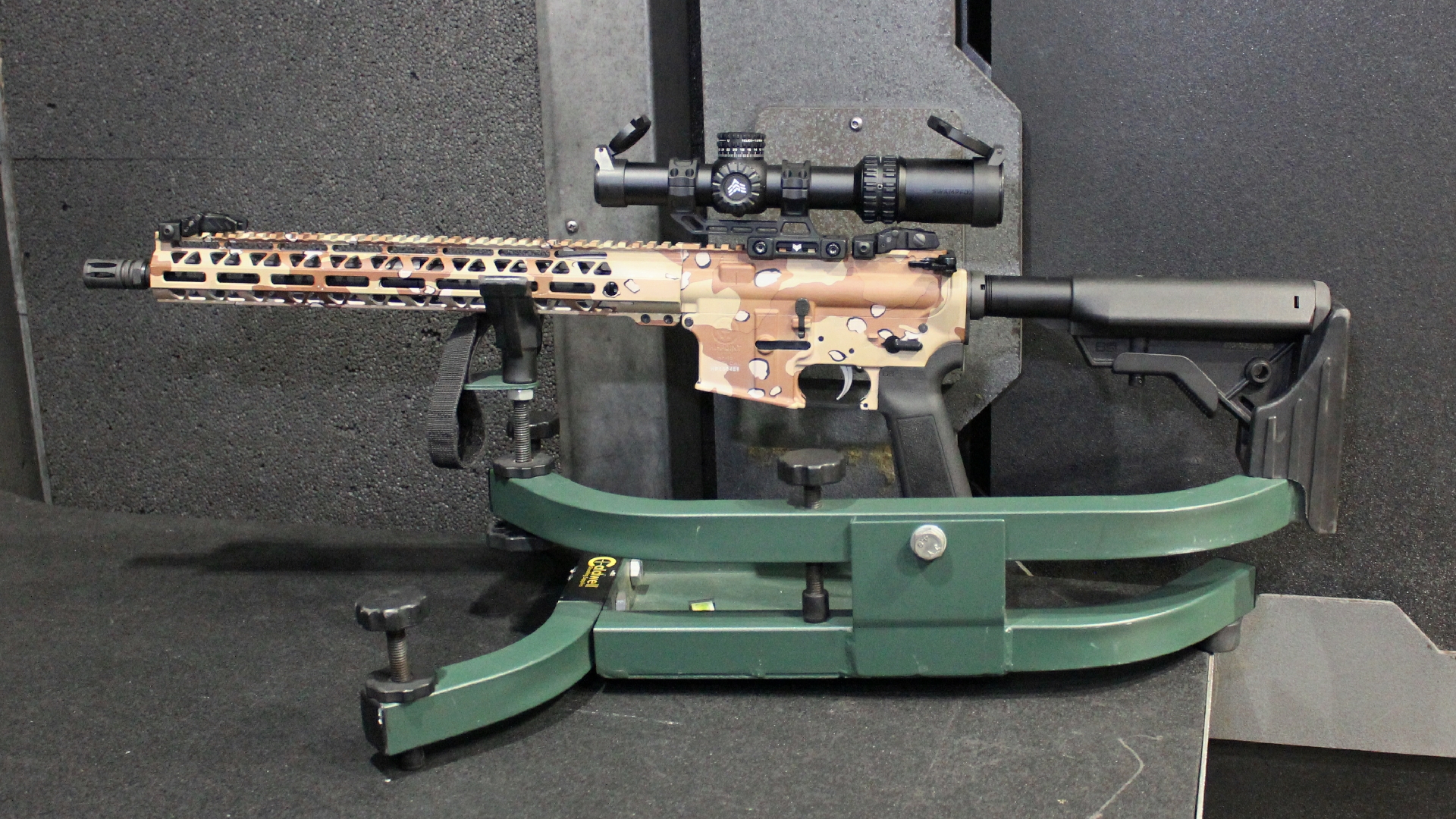 Now, let's dig into the upgrades for this model. The most obvious of these is the hydro-dip finish applied over the anodized surfaces of the handguard and both receivers. In this case, it’s the Six-Color Desert Pattern camouflage (aka. Chocolate Chip) which was popularized during Operation Desert Storm in the early 1990s. The company is also offering a US Woodland (M81) camouflage for the carbine and pistols.