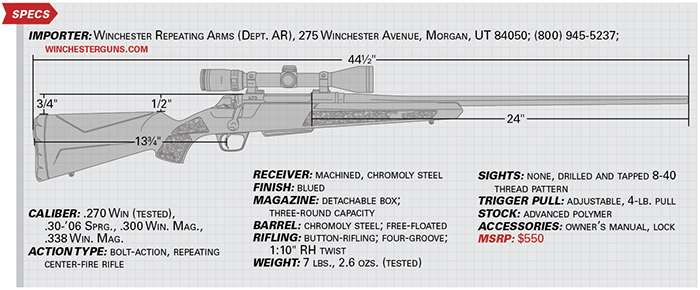 Winchester states the XPR barrels are the same as those found on today’s Model 70s, forged from chromoly steel, button-rifled and “thermally stress-relieved to ensure accuracy.” Also premium is the firm’s MOA Trigger, introduced a few years ago to make the Model 70 more competitive. It is touted as having, “zero take-up, zero creep and zero overtravel,” and while that may be overstating things, it is solid, fast and controllable. Our test rifle’s trigger broke at a consistent 4 lbs., which is ideal for a hunting rifle mostly fired from a rest, a perfect example of why clean breaks are more beneficial than super-light pulls in exciting encounters with game. I think these two high-value components are key to the rifle’s accuracy, but it also deserves high marks for the solid two-position safety and the adjacent bolt-release tab that allows the shooter to work the action with the gun on safe.