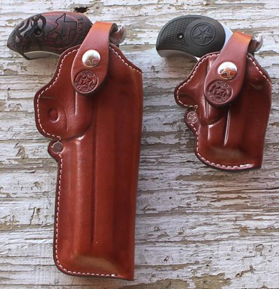 Holsters for the Texan are still in process but should be available on Bond's online store soon. I did get to try an early production BMT leather belt holster with snap strap. Setting the holstered Texan and Backup next to each other shows just how much of a size difference there is now.