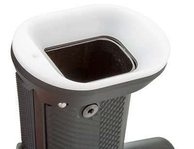 The basis for the Tomasie Custom Double Stack is the same stainless steel receiver we have already covered. It differs in the sense that it is a .40 S&W and uses a magazine with a capacity of 18 rounds. Also, the frame is designed for speedy draws, not tactical use, and therefore dispenses with the dustcover rail. There is checkering on the frontstrap and mainspring housings, as well as the controls. Tomasie’s version does have a non-traditional feature in the form of an oversize magazine well. Made of black-anodized aluminum, the well surrounds the butt with the stocks in place. It is fastened to the pistol by its interior shape and a longer-than-usual mainspring housing pin. It’s interesting to note that the interior of the magazine well is white polymer, which makes for an easy-to-find contrast against the dark magazine and a lubricious raceway for reloads. It adds bulk to the gun, but speed to magazine changes.