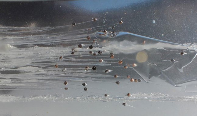 When fired into gel, the three disks stopped at 28.25", 27.75" and 25.75". The 12 BB pellets penetrated from 5" to 26.5", with five of the pellets stopping at around the 11" mark. Extracting the projectiles from the gel revealed that the top two disks were relatively unchanged while the third was pock marked by the BB shot. The BBs were deformed into odd shapes with angular and sometimes rough edges.
