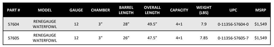 Three basic Renegauge models are on tap for 2020. Commonly they are equipped with synthetic stocks and are sold with locking, TSA-compliant hard cases and a selection of choke tubes. The lines are trim but rather angular, especially at the pistol grip, and the fore-end bulges on each side to house the gas release valves. The Field and Waterfowl versions are offered with either 26” or 28” barrels, but differ in stocks, the former in black, while the latter is camouflaged in Mossy Oak Shadow Grass Blades. The Turkey carries a bobbed 24” barrel, is decked out in either Mossy Oak’s Bottomlands or Obsession patterns, and its choke selection includes an extra-full tube.