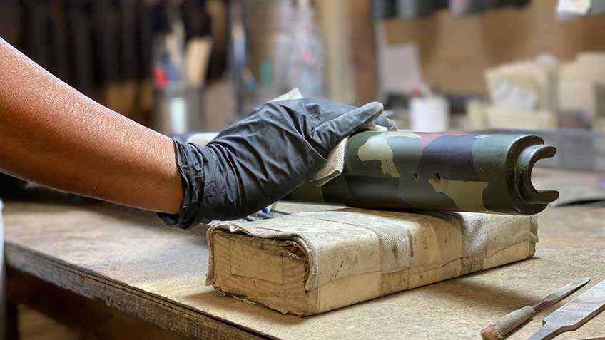 The composite stock's assembly begins with a pair of precision molds that will form the left and right sides of the stock. These molds are made in-house by McMillan staff in order to maintain quality. They are inspected, manually cleaned and lubricated each time they are used. If the stock has a molded-in color or pattern (camouflage, marbled, etc.), it's applied by hand to the interior mold at this stage. The rest of the resin and fibrous materials are then layered in.