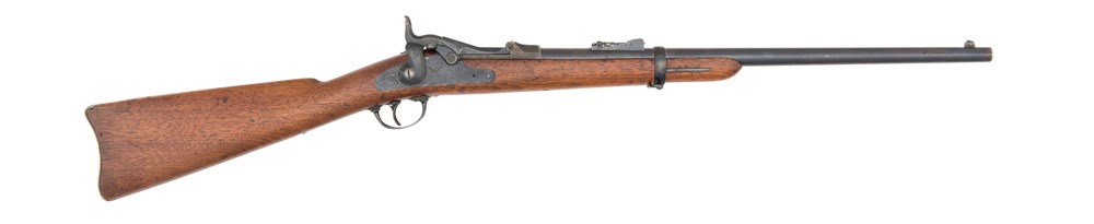 The Model 1866 was followed by the Model 1868, which was chambered for the same .50-70 Gov’t cartridge but featured a newly made receiver and was fitted with a barrel sleeved to .50 caliber and shortened to 32½". More than 50,000 (52,145) Model 1868 rifles were produced between 1868 and 1872. There were also 3,401 Cadet models (designated “Model 1869”) produced. Civil War-era lockplates (usually dated 1863 or 1864) were used, and the breechblocks were dated “1869” or “1870.” Four Model 1868 carbines were fabricated but never issued.