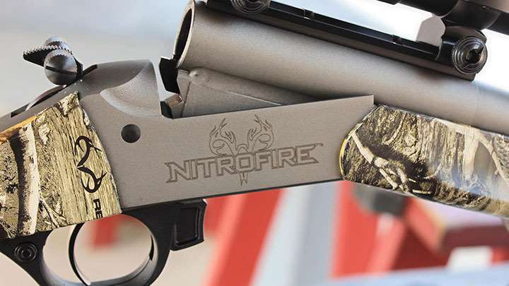 The exposed rebounding hammer has a set of knurled ambidextrous extensions for easy cocking when an optic is installed. The rounded black polymer trigger guard features a crossbolt safety button at the back with a barrel release lever located at the front. The NitroFire features the new Elite XT trigger system that allows the action to be opened with the crossbolt safety button engaged.