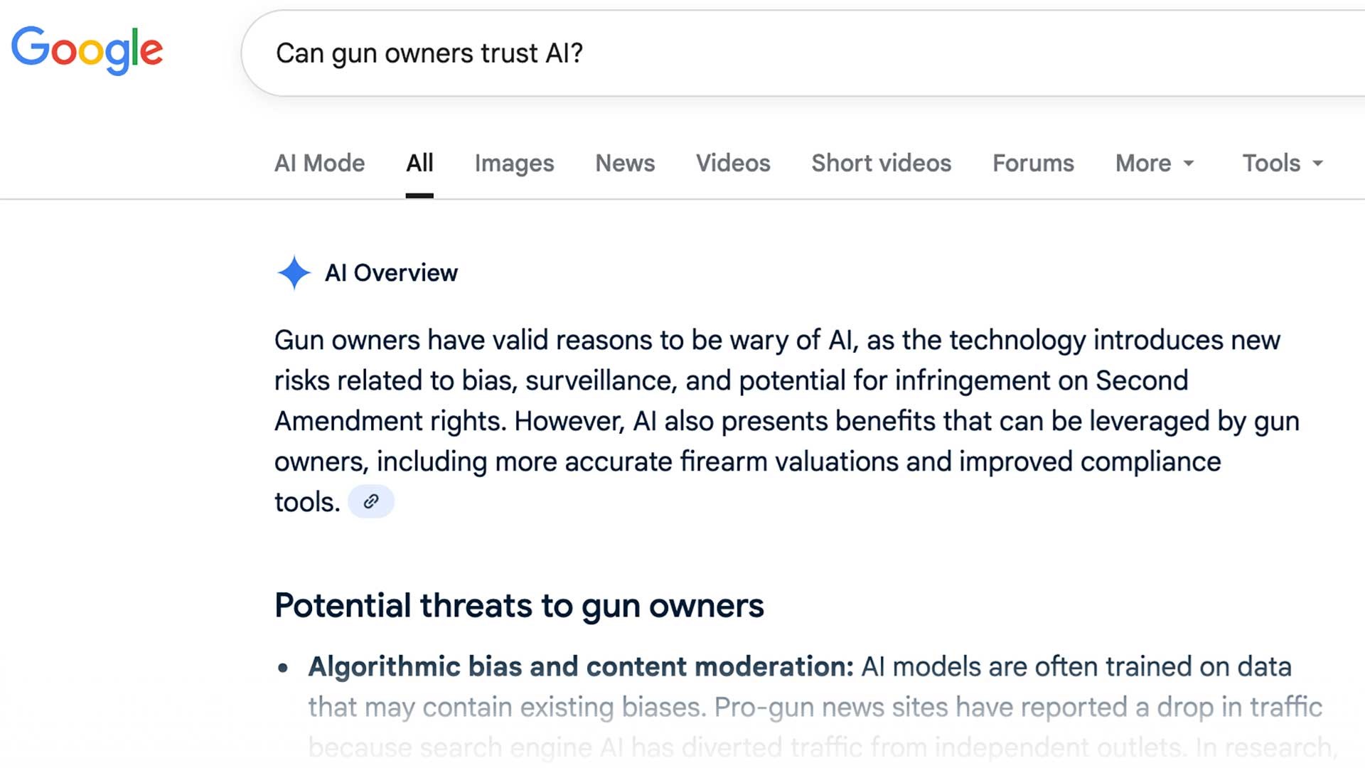 Most Google searches now return with a series of artificial intelligence (AI)-generated snippets that allegedly summarize information provided by linked websites. How it determines which details to display and whether pro-Second Amendment websites get equal consideration in results is a closely guarded, Silicone Valley secret.