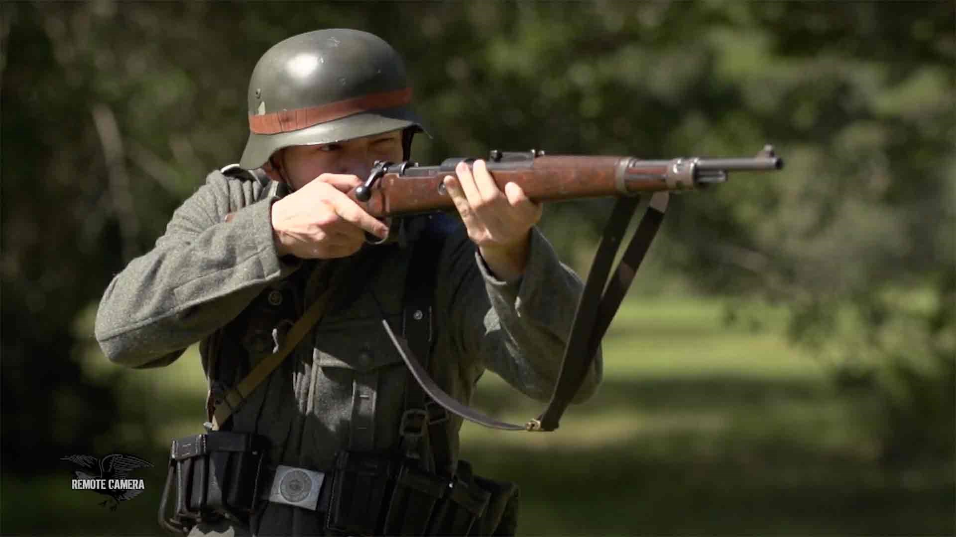 A reenactor dressed as a German Wehrmacht rifleman armed with a Mauser K98k.