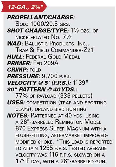 Designed for 1 1⁄8-oz. heavy target and 1¼-oz. field loads, Ballistic Products’ Z21 wads have notably thicker shotcup walls than standard wads, which intensifies the constriction for improved downrange patterns. As such, they’re well-suited for shots from 30 to 55 yds., and are ideal for trap. To complement the Z21, load it with “premium” No. 7½ nickel-plated lead shot, which maintains its spherical shape (for tighter patterns) and delivers additional clay-breaking energy. The recipe below delivered 77 percent of its pellets within a 30" circle at 40 yds. using an improved-modified choke.
