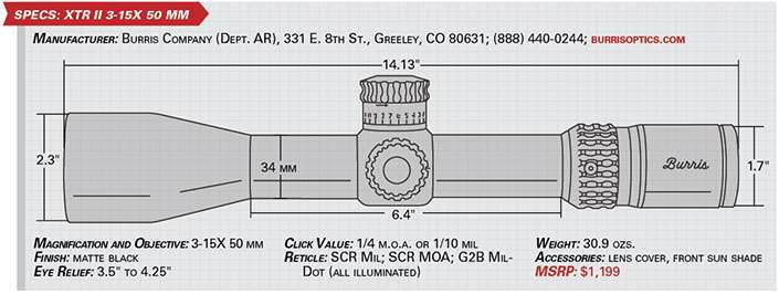 However, most longer-range shooters prefer their smart phone for computing range and windage adjustments, so I recently requested a couple of “manual” models for testing, a 30 mm-tubed 3-9X 40 mm C4 Plus with Wind MOA reticle as representative of hunting scopes, and a 34 mm-tubed 3-15X 50 mm XTR II with the SCR Mil illuminated reticle as a “tactical” model. Burris also sent along a pair of its XTR Signature rings for each scope. Like the more conventional hunting-style Signature rings, these have polymer Pos-Align inserts allowing close alignment of the scope with the bore, and also protecting the tube from “ring marks.”
