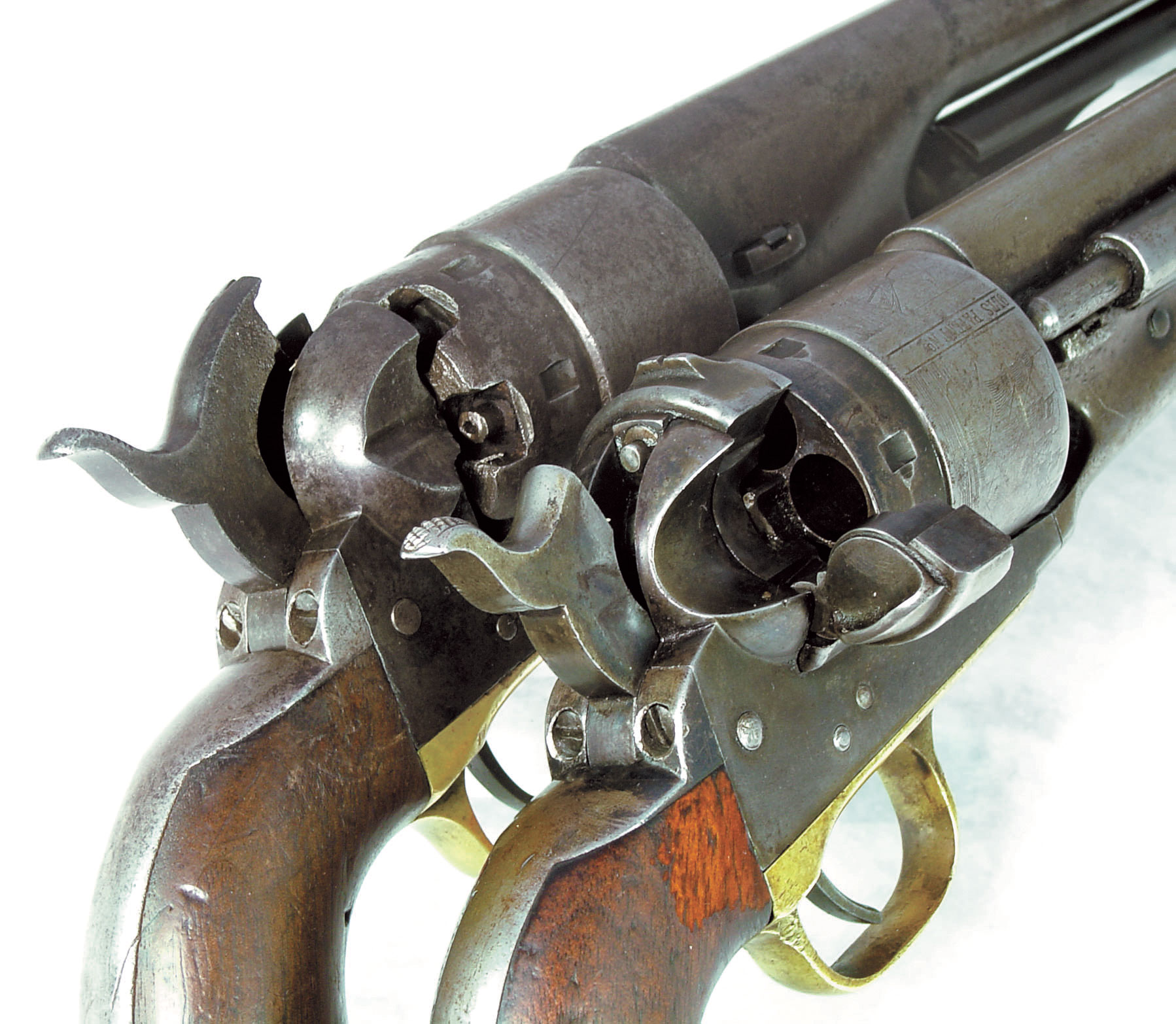 While externally similar to a standard Colt 1860 Army cap-and-ball revolver (inset, l.), the gun being discussed is a breech-loading, .44-cal., center-fire, 1860 Army Model Richards-pattern, metallic-cartridge revolver (inset, r.). It was not a conversion, having been originally manufactured to fire cartridges as shown by its low serial number.