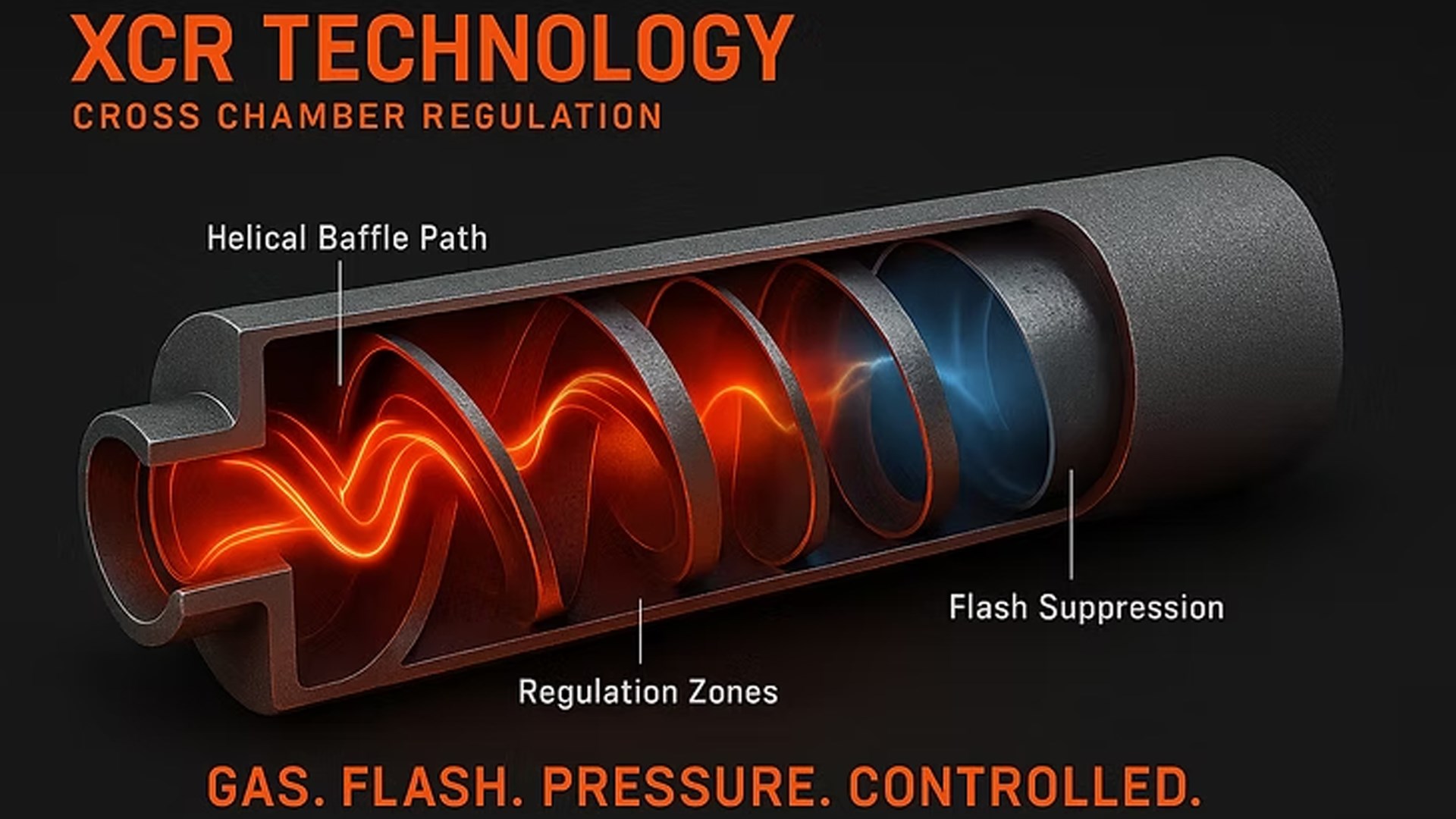 As the company explains it, “the helical baffle design forces gases into a controlled spiral, increasing dwell time and promoting a more even pressure drop across the suppressor. Unlike traditional linear baffle stacks that can create turbulent, uneven pressure zones, XCR’s spiral pathways work in harmony with cross-chamber metering to maintain balanced pressure from chamber to chamber. The result is smoother cycling, cleaner operation, and consistent performance during both semi-automatic and full-automatic fire.”