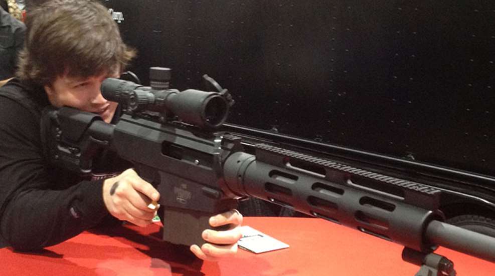 Remington Outdoors Co. had two big rifles commanding attention, according to the company’s Carlos Martinez. One was the new Bushmaster BA .50 BMG bolt-action with 30-inch barrel (shown at top). This 30-pound behemoth comes decked out in a Magpul adjustablebuttstock, and despite being a bolt gun, it shares the