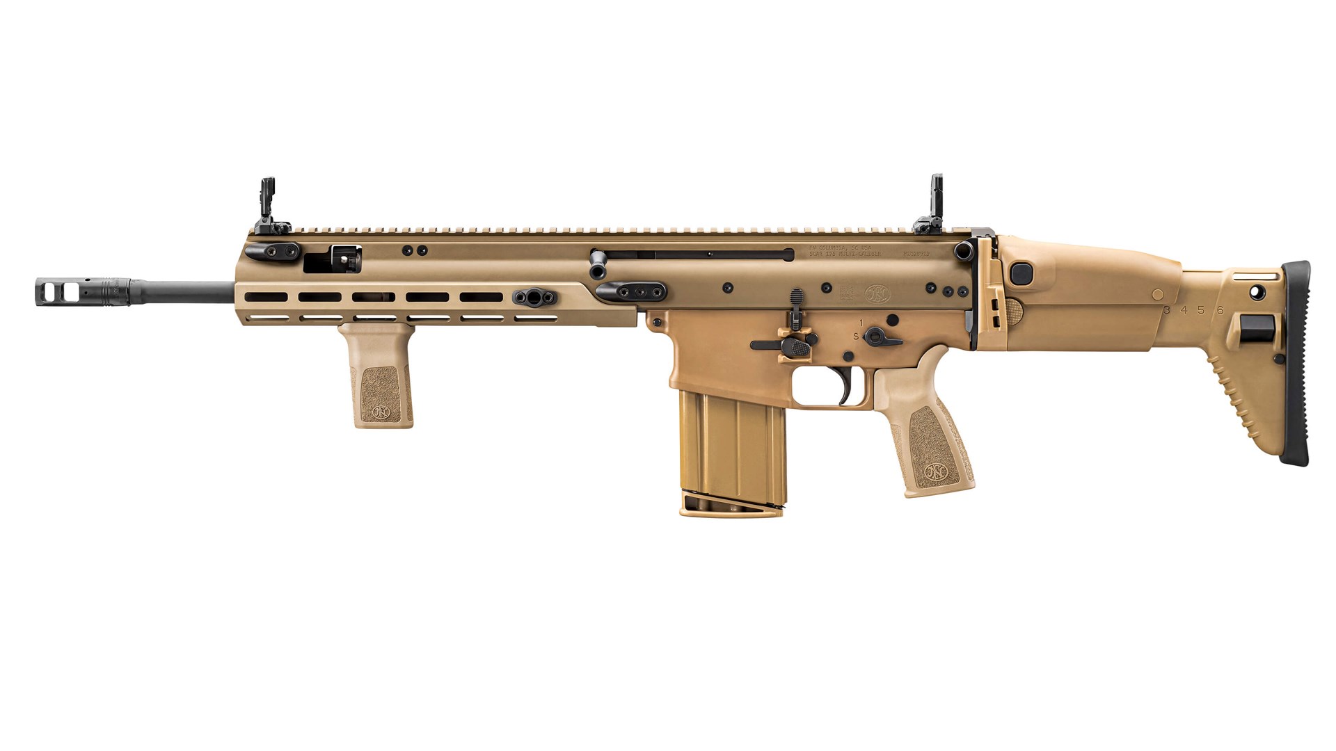 Additional details have been updated to bring the SCAR into the 2020s. The pistol grip now has true AR compatibility and there will be multiple buttstock options. QD sling swivel cups have been added to both sides of the rifle’s receiver and its buttstock. Finally, fasteners now use a Torx head. Barrels remain user-interchangeable and are made of cold hammer-forged steel and are chrome-lined. All new SCAR rifles use a Surefire ProComp muzzle brake. The 16S has its muzzle threaded 1/2x28 TPI and the 17S and 20S are threaded 5/8x24 TPI.