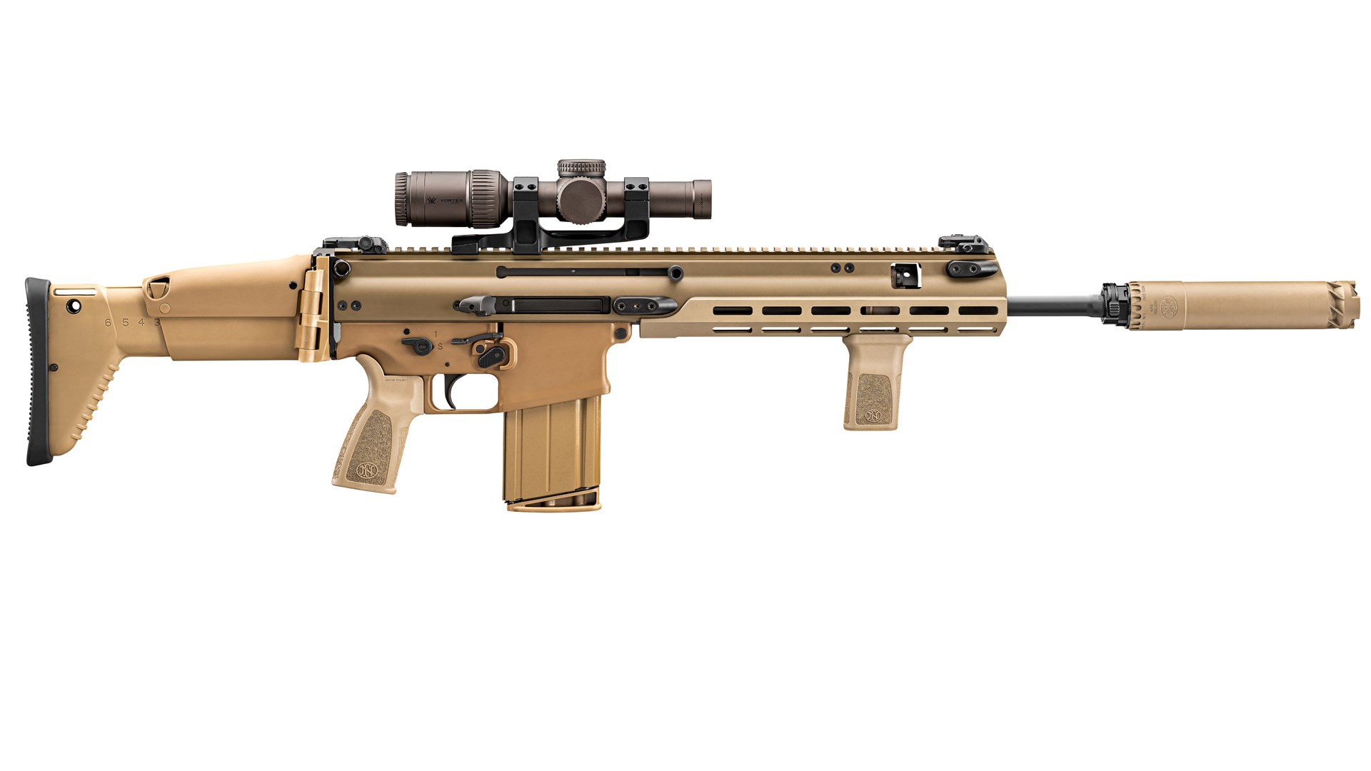 The FN QDs are a forward-venting design that uses a tube that is 3D-printed with Inconel superalloy and a stainless steel blast chamber, and are given a high-temperature C-Series Cerakote finish in either black or FDE. The suppressors are optimized for reliability, accuracy, sound reduction and minimum backpressure, were tested with 10,000 rounds of fully-automatic fire and meet all Department of Defense SURG requirements. The 5.56 mm model has a decibel rating of 149 db, while the 7.62 mm version (which is .300 Magnum rated) is rated at 145 db. When tested on the new SCAR rifles, FN claims less than a 1-MOA point-of-impact shift.