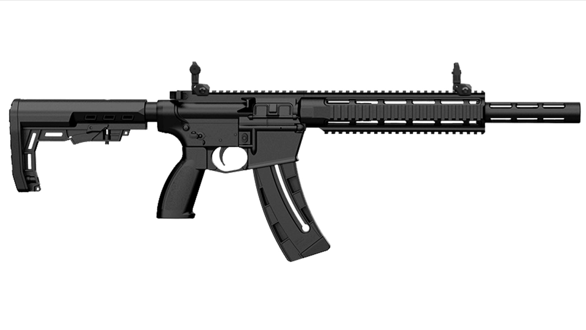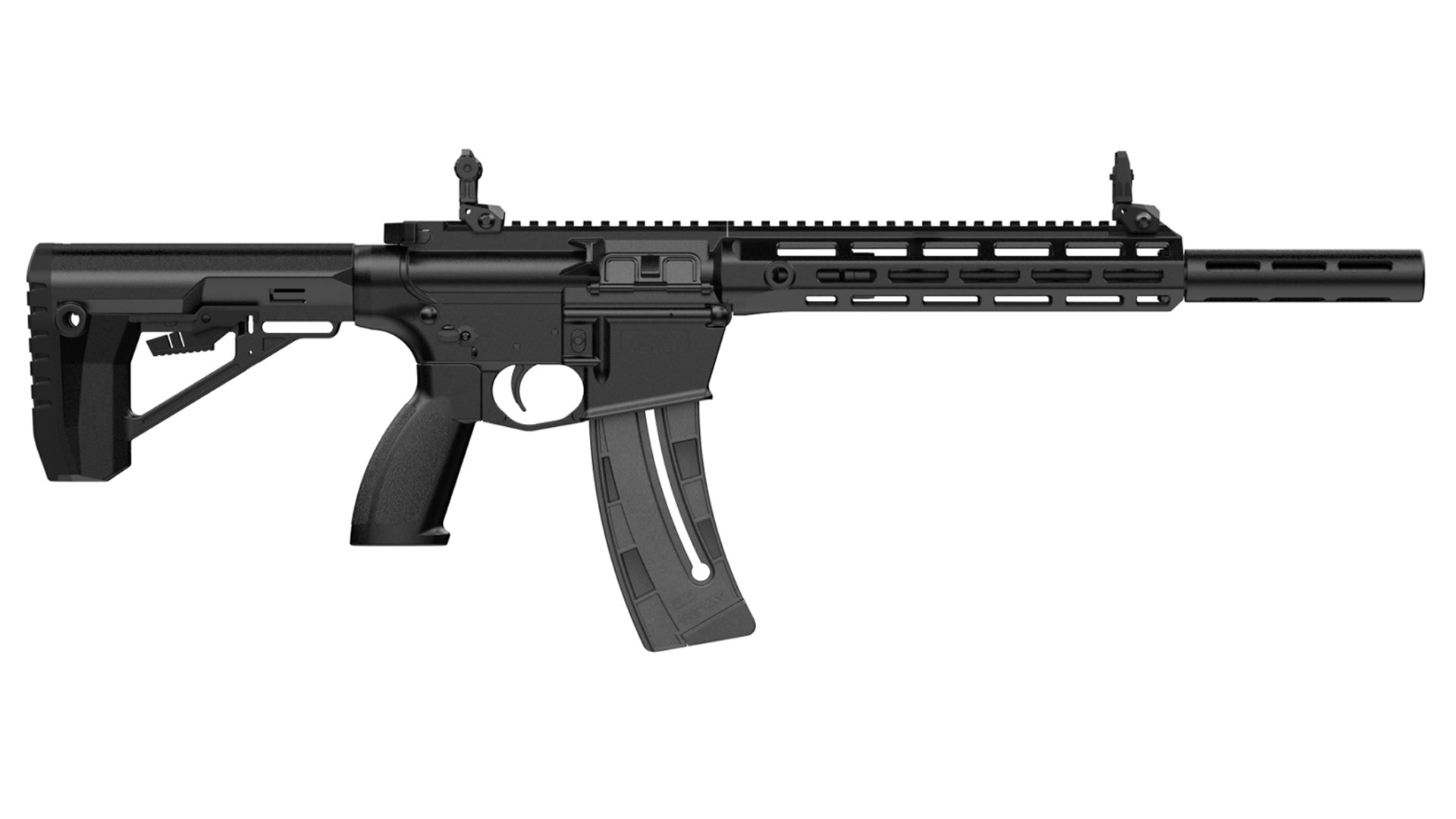 RA1522 firearms are chambered in .22 LR and use a blowback-operated action with a polymer upper and lower receiver. Controls mimic the AR-15, with a rear mounted ambidextrous charging handle, bilateral safety selectors, a left-side bolt release and right-side magazine release. Other details include a working dustcover, molded-in case deflector and Picatinny rail for the length of the upper receiver and handguard. Each RA1522 is supplied with front and rear folding adjustable back-up sights. Magazines have an assist tab for loading and a capacity of 25 rounds. They are available in 10-round capacities as well. Both retail for $40.