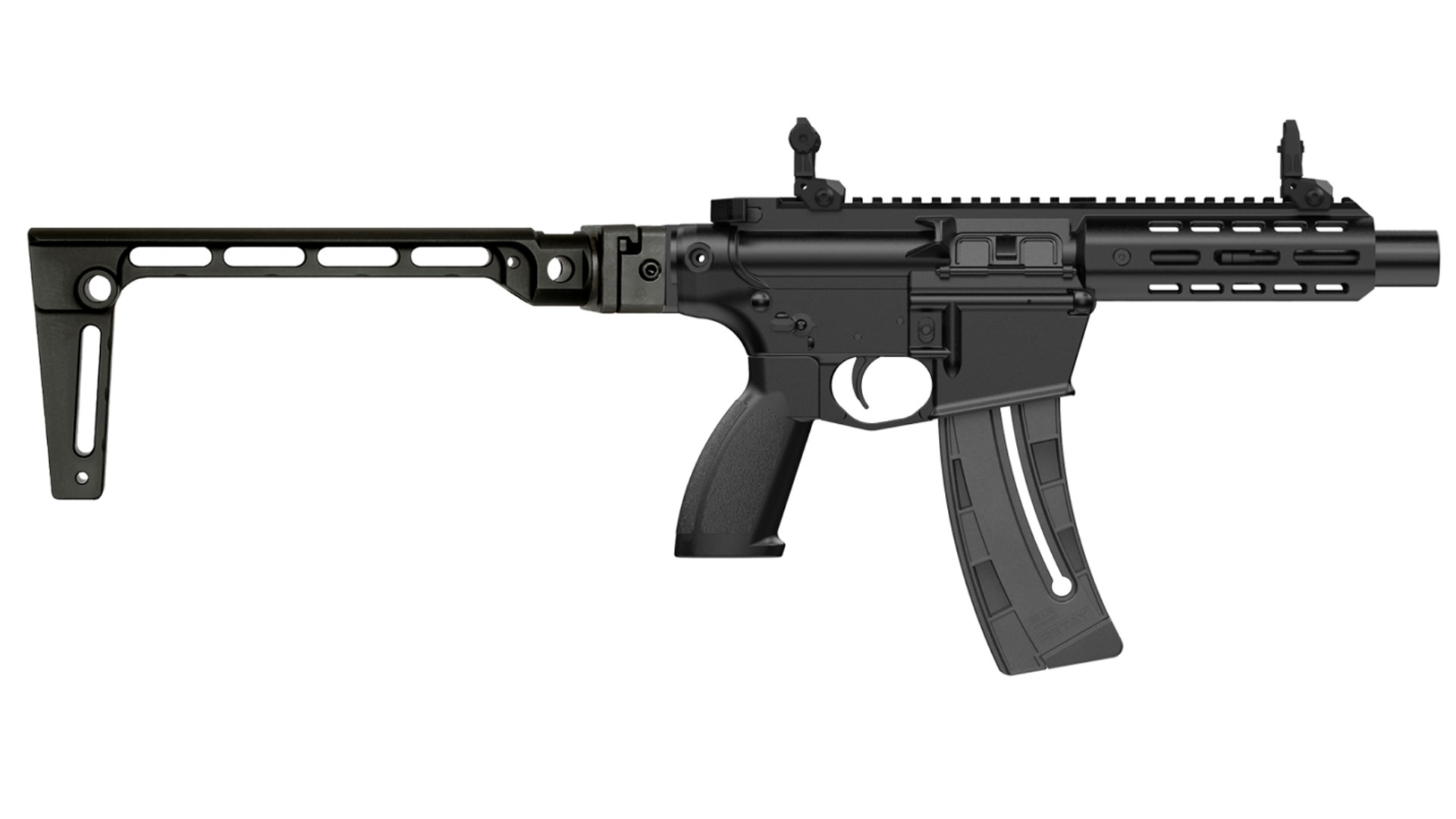 The pistol version has an 8.34-inch barrel and has a section of Picatinny rail on the rear of the receiver for attaching a stabilizing arm brace or other accessory. Its forearm is made of aluminum and has M-Lok attachments points. With the brace folded, it has an overall length of 16 inches and weighs 3 pounds, 4 ounces. Its MSRP is $359.