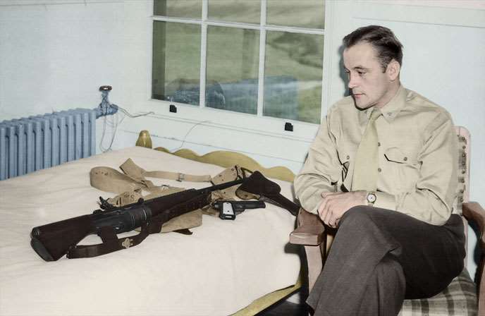 Marine paratrooper officer Harry Torgerson, an avid proponent of the Johnsons, developed a friendship with Melvin Johnson, Jr., and visited the Rhode Island plant on several occasions. On one of his visits, just prior to the departure of Torgerson’s unit to the Solomons, Johnson showed him one of the prototype Auto-Carbines. Torgerson was immediately smitten with Daisy Mae, but Johnson was adamant that, under no circumstances, would any of the Auto-Carbines be allowed to leave the plant since they were still under development.
