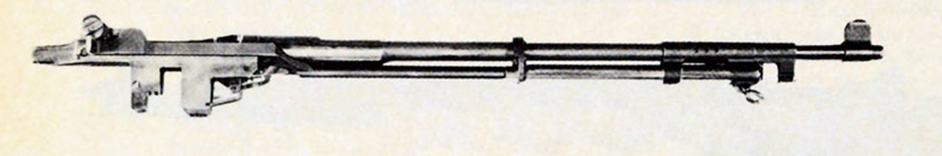 M1E9—The significant feature of the M1E9 Rifle can be inferred from the history of the M1E4. To eliminate the heating encountered in the -E4 design, a long piston with a shorter stroke was used. In this design, which again was a cut-off expansion-type gas system, the piston moved back about 1.5" instead of the 4.5" of the M1E4. The energy to cycle the mechanism could be transferred through the operating rod in the time required to complete this motion. When the piston came to a stop, the operating rod and bolt continued to the rear through inertia. Again, the total cycle time was equivalent to that of the standard rifle. The far-advanced production status of the M1 Rifle at that date, however, did not warrant major redesign of the M1 Rifle to incorporate the new gas system.