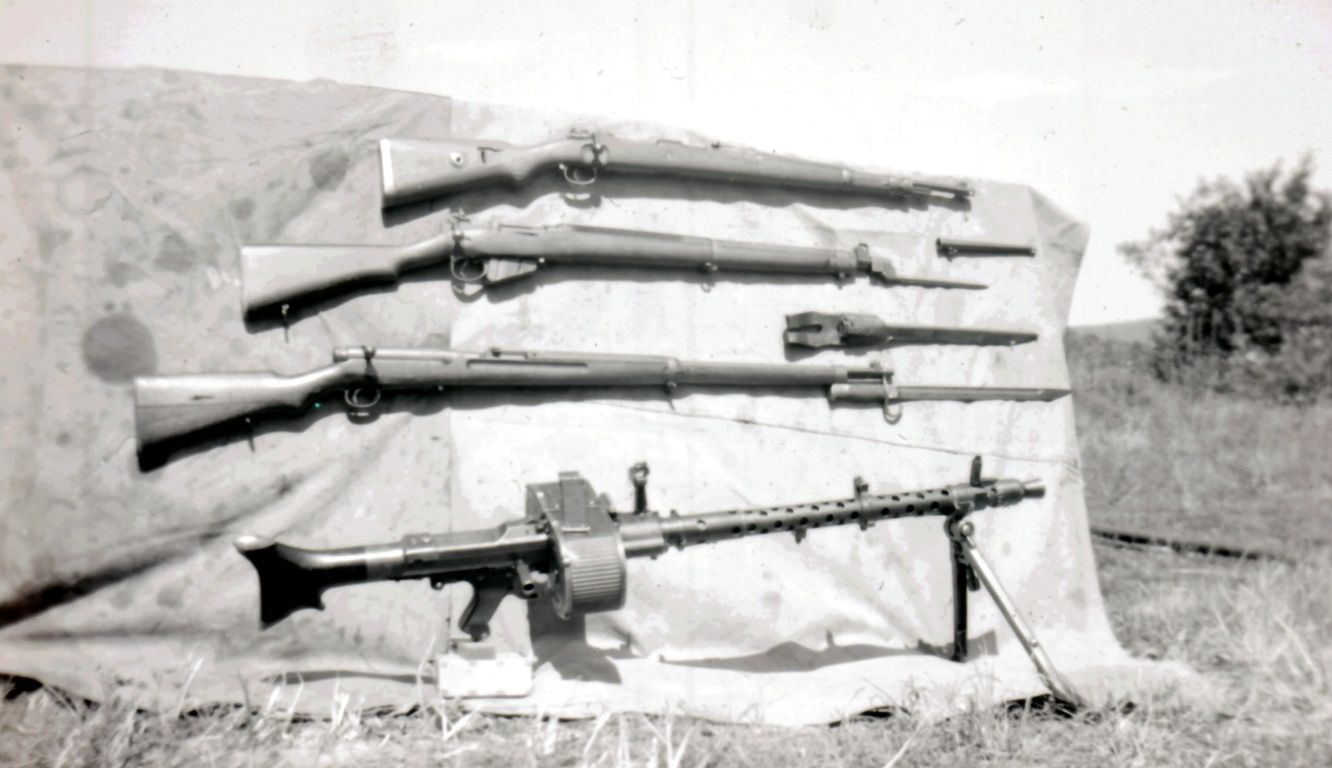 After returning from Kiska: A FSSF display including a captured Japanese Arisaka rifle, along with a German MG34 LMG and Mauser Karabiner 98k rifle, along with a Canadian Lee-Enfield No. 4 Mk I (not used by the Forcemen). Author’s photo collection.