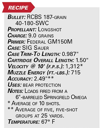 Bullets cast of old-style wheel weights, which consist of roughly 4 percent antimony—and my addition of 2 percent tin to the melt to help cast fully formed bullets—are perfect for the 10 mm. The bore of my Springfield Omega 10 mm was shiny as a new dime after shooting 40-some wheel-weight bullets cast from an RCBS 40-180-SWC mold. They are hard enough that they will not expand, yet pliable enough to remain intact after hitting bones. Paired with 8.8 grains of Longshot propellant, they clocked 1,266 f.p.s., and the velocity increased to 1,312 f.p.s. with 9.0 grains. Standard deviation of velocity was 11 f.p.s. for the recipe load over 10 shots.