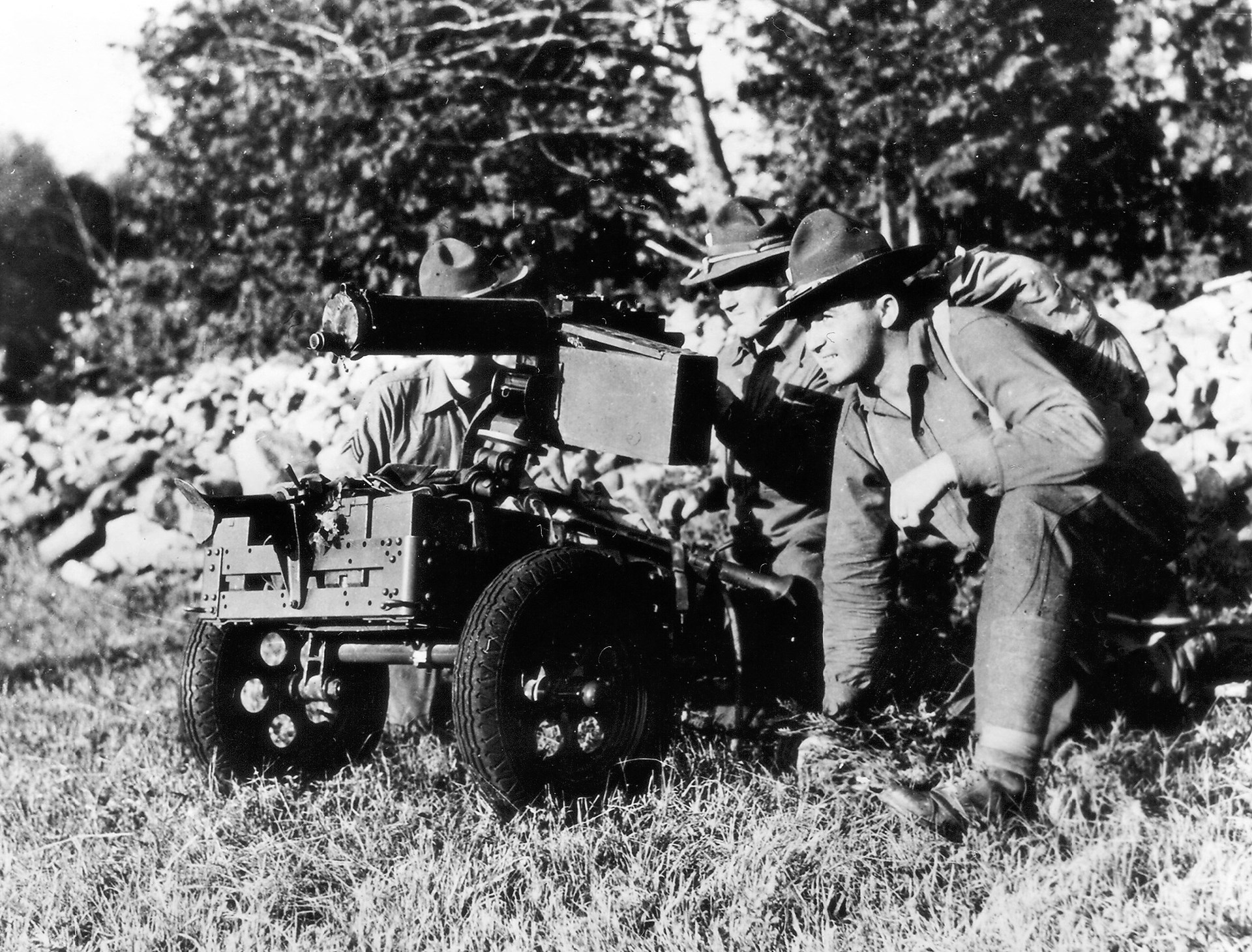 “It was an improved development of World War I, where it was discovered that machine guns could do more than merely spray an enemy attacking in front of their very muzzles. In mounting the gun solidly, it was learned that an even distribution of bullet strikes could be spread nicely over a fixed and predetermined area, making the old spray gun an excellent long-range weapon. It was also discovered that with fixed tripods and artillery type instruments (range finders, aiming circles) machine guns could be fired accurately at targets not in the view of the gunner—indirect fire.