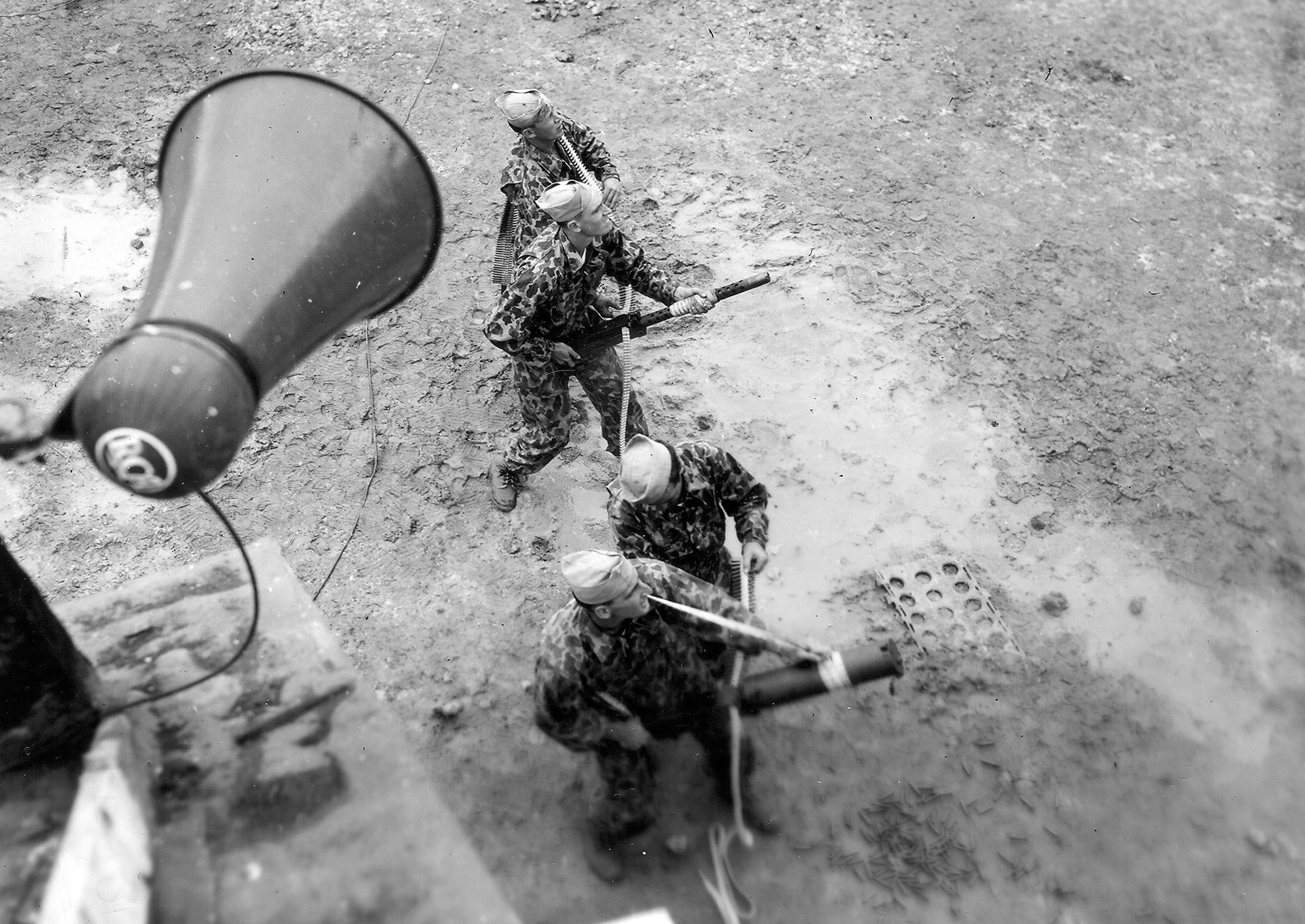 Sergeant Basilone: They were very close together. There was only about two-foot distance between them. I fired one, and when I finished firing that one, I just rolled over to the other and fired it and immediately reloaded the two guns.