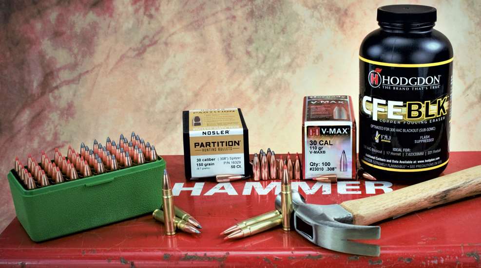 (l.) When working up a .300 HAM’R load, Hodgdon CFE BLK is the preferred propellant of both the author and Wilson Combat’s Bill Wilson. The author found it to meter well and allow for more-than-adequate charges within the Starline cases he used. Hornady’s economical custom-grade die sets (l. ctr.) work well and encourage loading for new chamberings. The company’s V-Max 110-grain bullets (r. ctr.) and Nosler’s 150-grain Partitions (r.) stand at either end of the weight spectrum for .300 HAM’R. Photos courtesy of author.