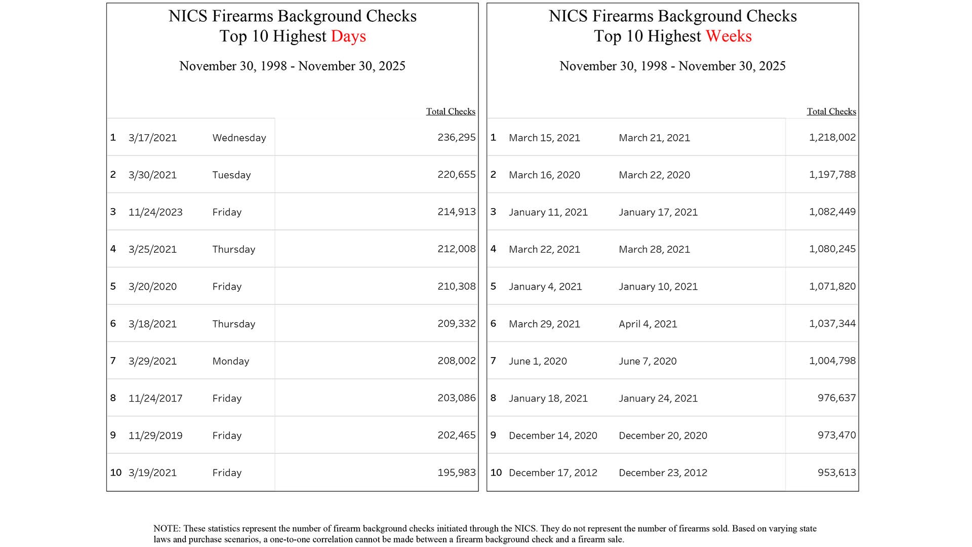 The National Shooting Sport Foundation (NSSF) estimates the FBI’s National Instant Criminal Background Check System (NICS) completed 530,156 background checks related to firearms for the week leading up to and including Black Friday—one of the busiest shopping days of the year. That figure is down from 2024’s total of 613,380 for the same period. The numbers reflect a 13.6 percent decrease from the 2024 figure.