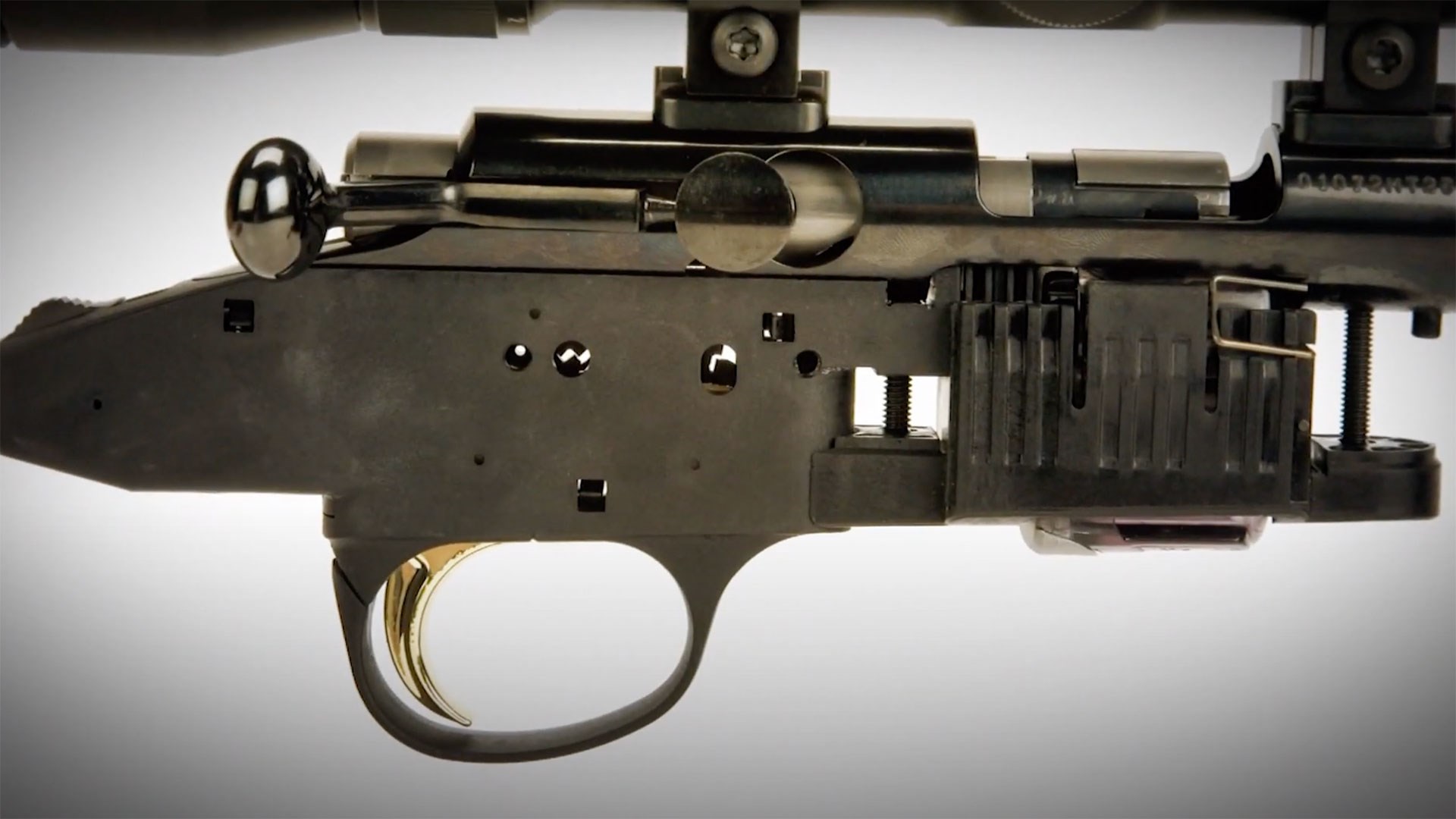 Chambered for .22-cal rimfire cartridges fed from a detachable box magazine, the T-Bolt was first released in 1965. At the time, Most rimfire rifles on the market had more traditional actions, like lever, slide and bolt actions. The T-Bolt derived its name from the unique ball-and-socket, bolt-handle design, which is "T" shaped and interlocks with the receiver when pushed forward. Two circular cut lugs on the handle engage with the bolt body and receiver to create lockup. The handle design is relatively simple, with the handle consisting of a single component that is linked to the bolt via a pin.