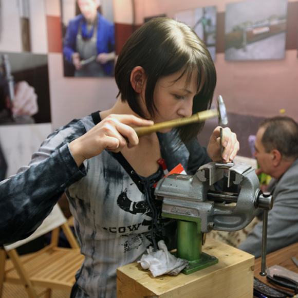 An engraver works on a Bulino pattern at one of a Ferlach gunmaker's booth.