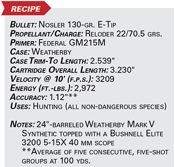 Owing to Weatherby’s characteristic extra-long leades, when chambered in one of its namesake cartridges, the company’s rifles—especially in cases of advanced throat erosion—can be persnickety with ammunition at times. Sound familiar? Go leadless. Such proved to be the case in a well-used, Japanese-made Mark V Synthetic in .270 Wby. Mag. that I employed for this piece. By using Nosler’s 130-gr. Expansion Tip (E-Tip) gilding metal bullet, I was able to shave 0.24" off the 25-shot average of the lead-core projectile from a previous installment of this column. The benefits don’t stop at accuracy, either; since the copper-alloy projectile retains 95 percent of its pre-expansion weight during upset, it’ll penetrate deeper than comparable lead-core bullets, providing insurance on less-than-ideal shots. And, since the .270 Wby. Mag. has the most voluminous case among the factory .27-cal. cartridges, even with the 1.322"-long projectile in place, there’s ample space for propellant to push it fast and take advantage of its 0.459 G1 ballistic coefficient.