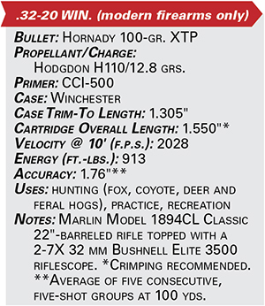 Principally kept alive by cowboy action shooters and metallic silhouette handgun competitors, the now-134-year-old .32-20 Win. has capabilities that are seldom realized. For shooters with a T/C Contender, or another modern rifle with a strong action, such as the Marlin Model 1894CL Classic used here, the modest .32-20 can take on a new persona. The load below propels the 0.312"-diameter Hornady XTP to 2028 f.p.s. from the Marlin’s 22" barrel, resulting in 913 ft.-lbs. of energy at the muzzle and maintaining 450 ft.-lbs. just beyond 150 yds. When zeroed at 100 yds., the bullet impacts 4" low at 150 yds. and 7.5" low at 175 yds. That makes the round useful for hunting predators and, in the hands of a skilled marksman, feral hogs and whitetail deer, too—provided that shoulder shots are avoided.