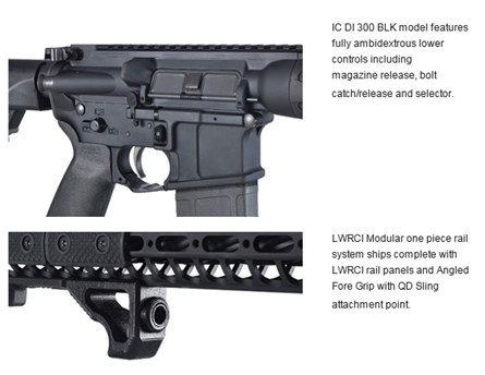 The IC DI 300 BLK model features many of the same performance attributes found in its popular gas-piston luxury AR lineup. Custom rifle features include a Monoforge upper, modular one-piece free float rail, LWRCI cold hammer-forged cold hammer forged heavy barrel, fully ambidextrous lower controls (mag release, bolt catch/release and selector switch), angled ergonomic fore grip, Mil-spec 6-position buffer tube and LWRCI proprietary advanced DI Bolt Carrier group with keyless gas key. As with all LWRCI rifles, the IC DI 300 BLK is available in a California-compliant model.