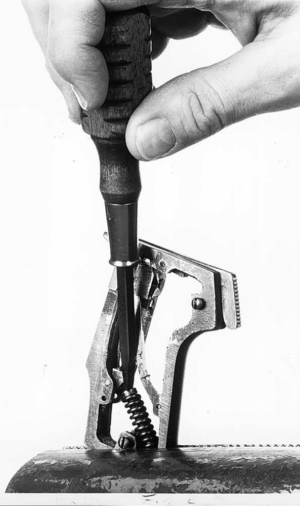 The mainspring (12) is under compression, and it and its strut (13) must be pried out from the butt with great care to prevent possible injury or parts loss. It is recommended that the frame be clamped in a padded vise for this operation and for reassembly.