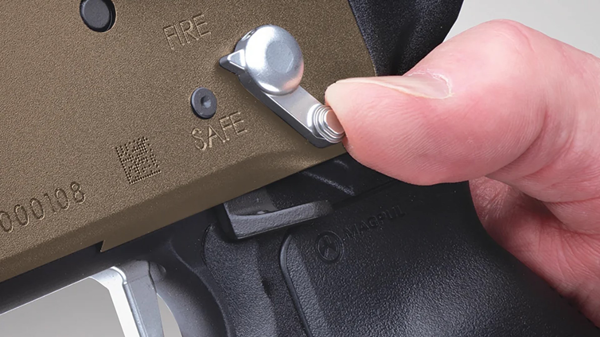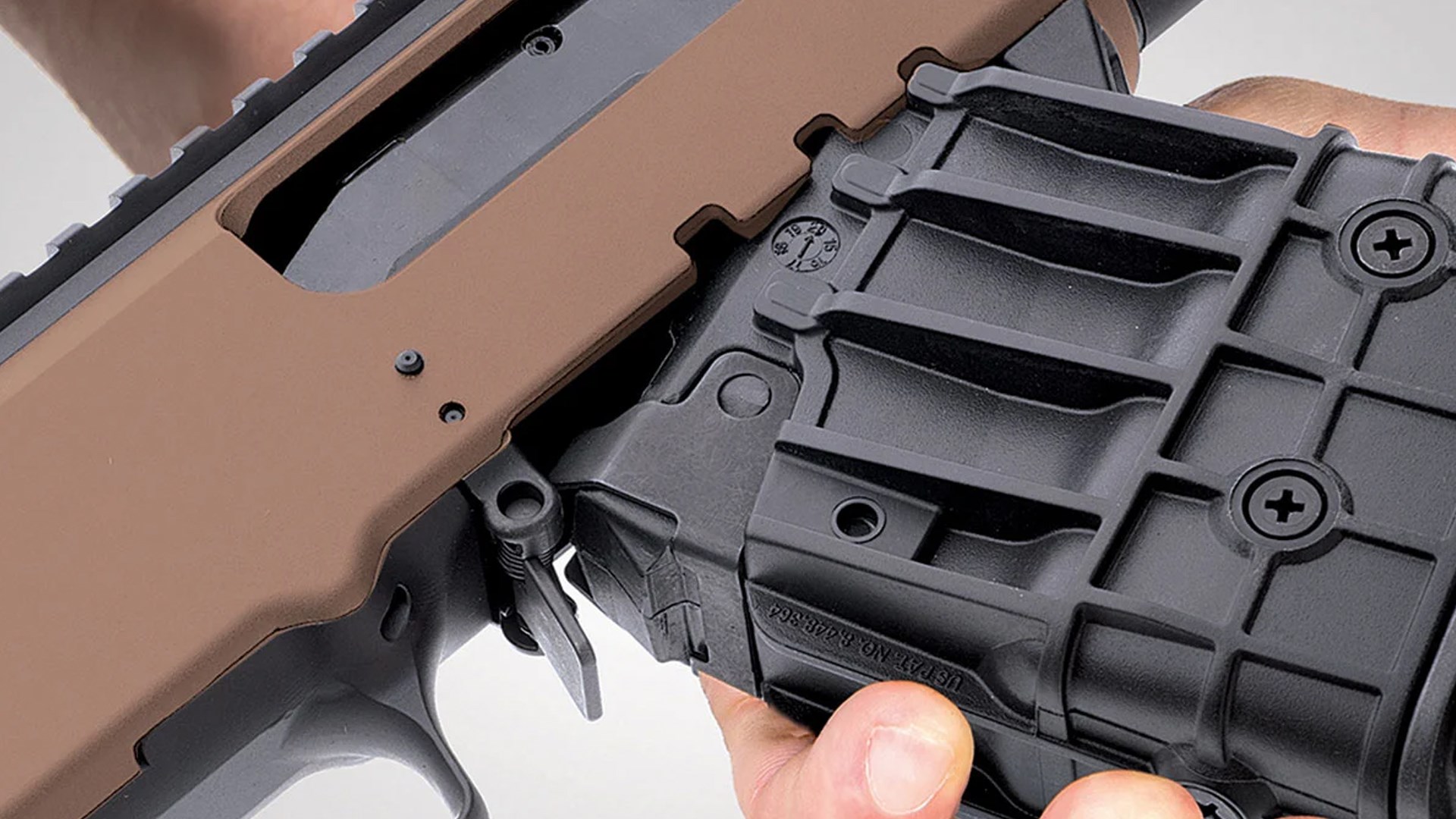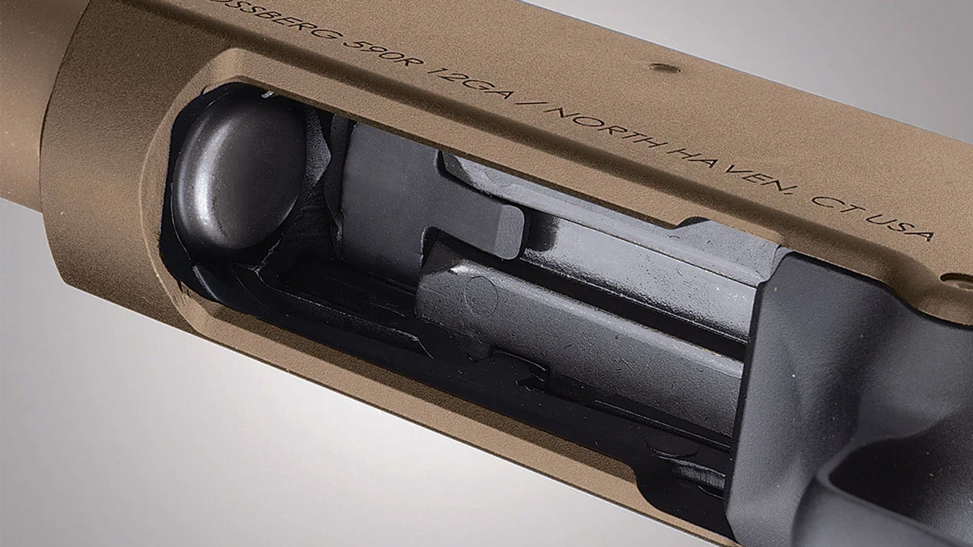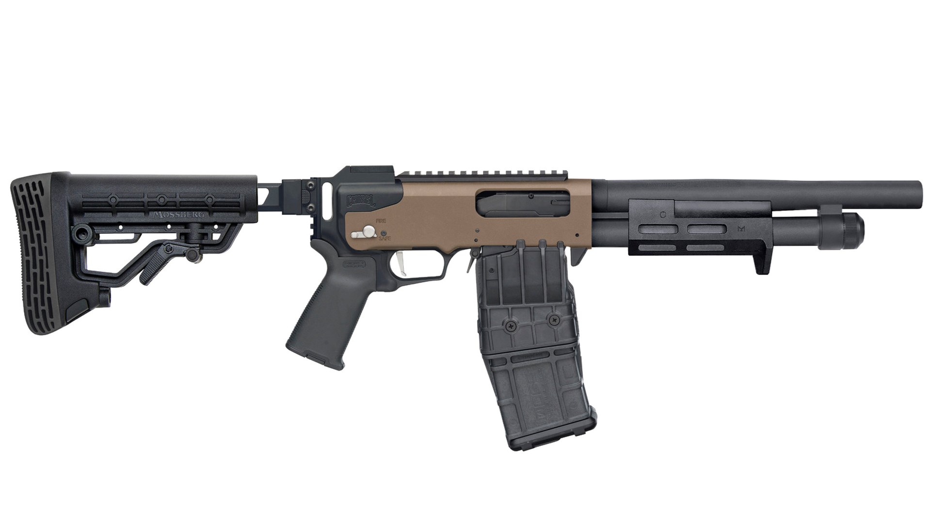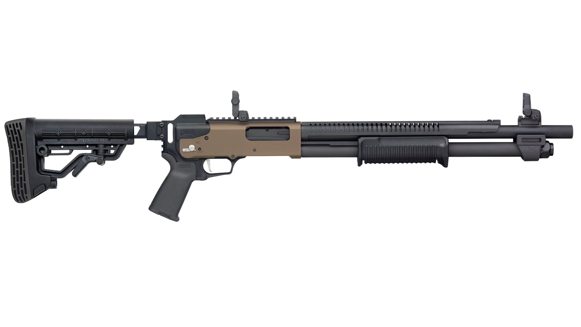 Mossberg is now offering this stock on two 12-ga. models of the 590R, a design update with a bilateral rotary safety selector that was introduced last year. Their receivers have a flat dark earth (FDE) Cerakote finish with parkerized steel parts. A Pictainny optics rail is mounted on top of the receivers. Barrels use Mossberg’s Accu-Choke system and come with a cylinder bore choke installed. Triggers are flat-faced.