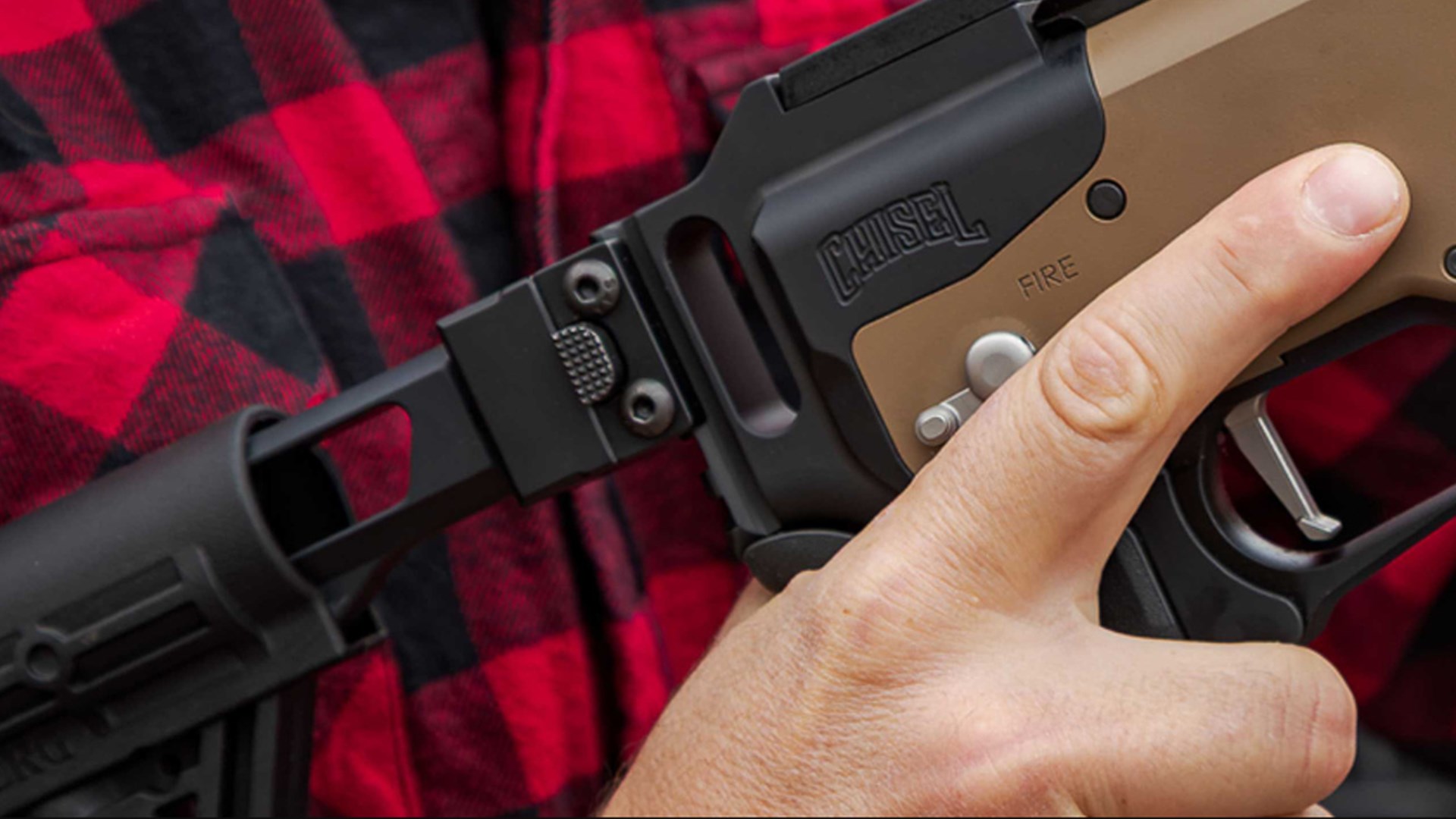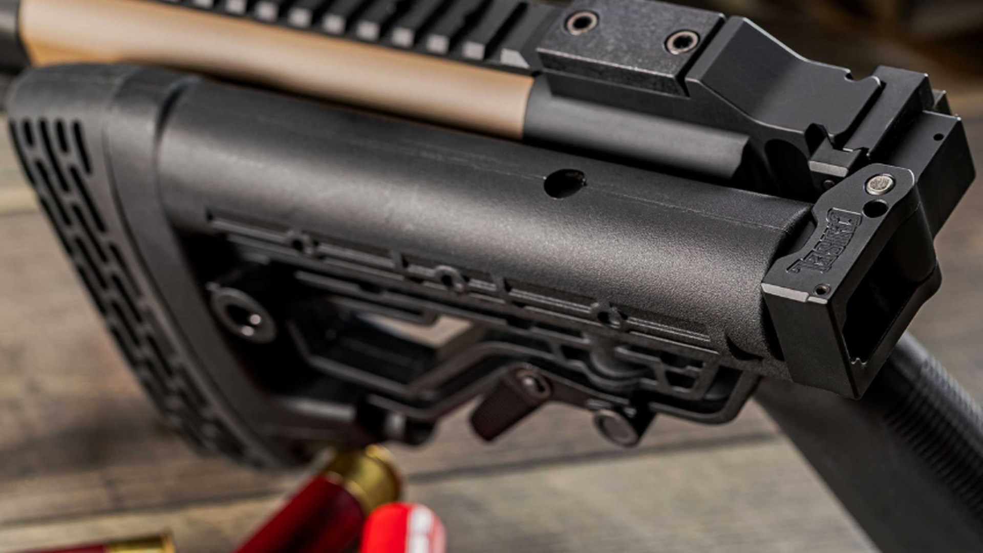 The Chisel Machining folding stock uses a 7075 aluminum folding knuckle with a push-button locking mechanism. The stock locks in the extended position and is unlocked in the folded position. To this is attached an aluminum buffer tube-type mount compatible with M4-style stocks with eight positions of adjustment allowing for the length-of-pull to be adjusted between 12.5 and 16.5 inches. A Mossberg-designed stock with a recoil pad and two QD swivel sockets is used. The stock also allows the use of AR-15-type pistol grips and a Magpul MOE+ grip is mounted. A red-dot optic mount with an RMR footprint is incorporated into the rear of the stock where it mounts to the rear of the receiver.