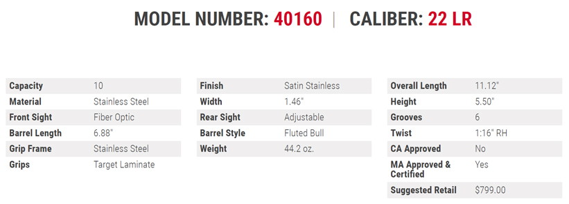 The Mark IV Hunter model #40160 features a stainless steel fluted barrel, a HIVIZ fiber optic front sight and is now available with smoothly contoured, wood laminate target grips for precision shooting. The Mark IV Target model# 40159 features a satin blued alloy steel bull barrel, adjustable rear target sight and is also now available with smoothly contoured, wood laminate target grips. Both of these models are Massachusetts Approved and Certified. All Mark IV pistols feature the same legendary, one-piece barreled receiver and internal cylindrical bolt construction. The robust design ensures permanent sight-to-barrel alignment and higher accuracy potential than conventional moving-slide designs.