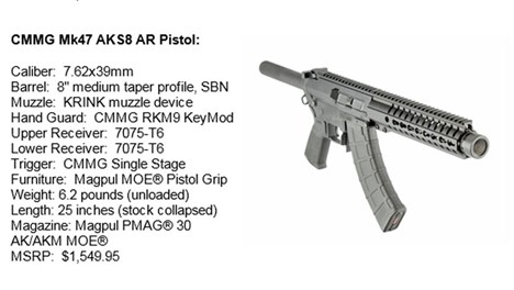 The new Krink models include the Mk47 AKS8 AR Pistol, Mk47 AKS8 SBR (short-barreled rifle) and Mk47 AKS13 rifle. The Mk47 AKS8 SBR (all NFA rules apply) has an 8’ barrel with a 9” RKM KeyMod Handguard, a Magpul CTR Buttstock and Magpul MOE Pistol Grip. It comes with a CMMG single-stage trigger and one Magpul AK PMAG.
