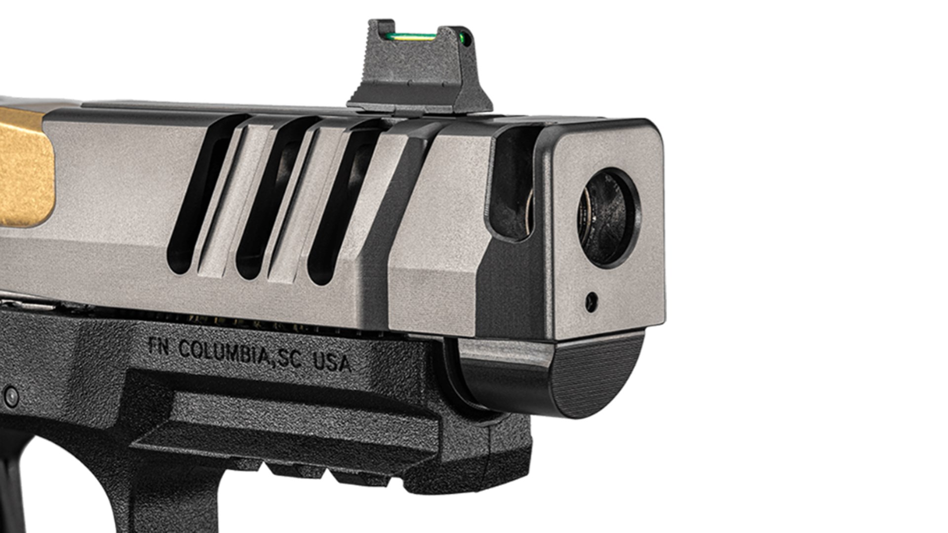The basic features of the new pistol follow those of the original 509 CC Edge. Its 4.2” cold-hammer-forged, stainless-steel barrel has a titanium-nitride PVD finish and a quick-detachable compensator that FN claims reduces muzzle flip by 25 percent. The stainless-steel slide uses the distinctive lightening cuts found on other Edge models and has a graphite PVD finish. Sights are a front post with a fiber-optic insert and a rear notch that are of a height that will co-witness with an electronic optic. The slide is cut for optic mounting, a variety of which can be fitted through FN’s optics-plate system.