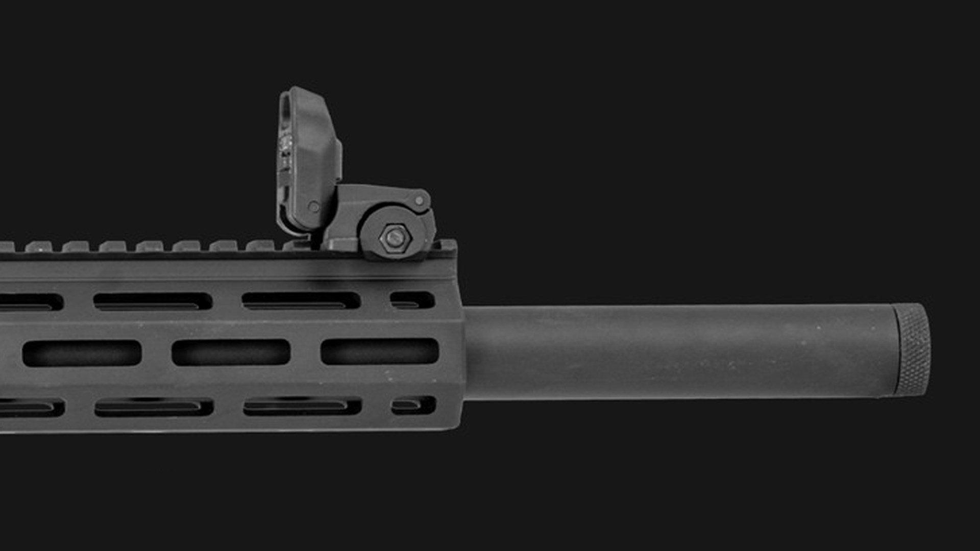 The ELITE ISS rifle has a 16-inch integrally-suppressed barrel that gives a 26 db noise reduction for a reading of 115 db at the muzzle. This is paired with a 12-inch aluminum free-floating handguard with M-Lok slots and a telescoping buttstock mounted on the receiver extension. It has an overall length of 32.625 inches to 35.75 inches, depending on the position of the stock, and weighs 4 lbs., 14 ozs.
