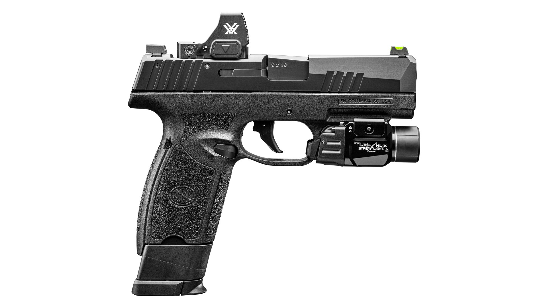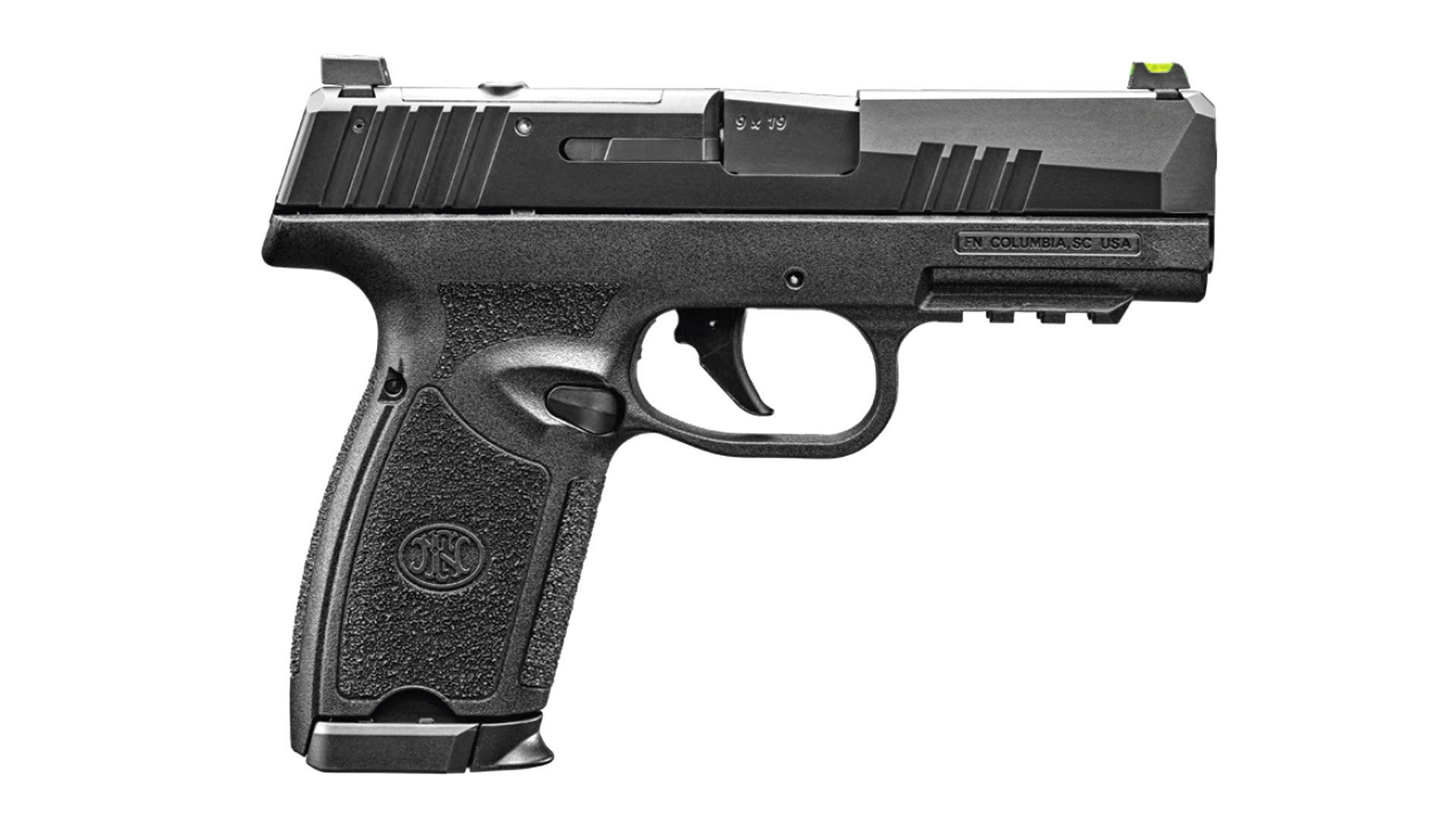 The 309 is available with or without an external manual safety lever and has a built-in trigger safety and hammer-block safety. Its polymer frame is a totally new design with a neutral grip angle designed for a natural point of aim that is “one size fits all” and does not use interchangeable backstraps. The frame’s dustcover features a three-slot M1913 Picatinny rail for mounting lights and lasers. Barrels are made of FN’s machine-gun grade alloy steel and have a recessed target crown.