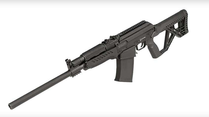 Starting off with an enlarged AK-style receiver, the gun comes complete with a piston-driven operating system is designed run the gamut of 12-gauge loads, ranging from standard field-grade shells to 3” magnum loads. On the right side of the receiver is an AK-style stamped selector, along with a ledge that allows operators to activate the safety with a simple finger swipe. A fixed, reciprocating charging handle is on the bolt’s right side. AK-style iron sights are mounted on receiver’s top, and a paddle-style magazine release is found in front of the trigger guard.