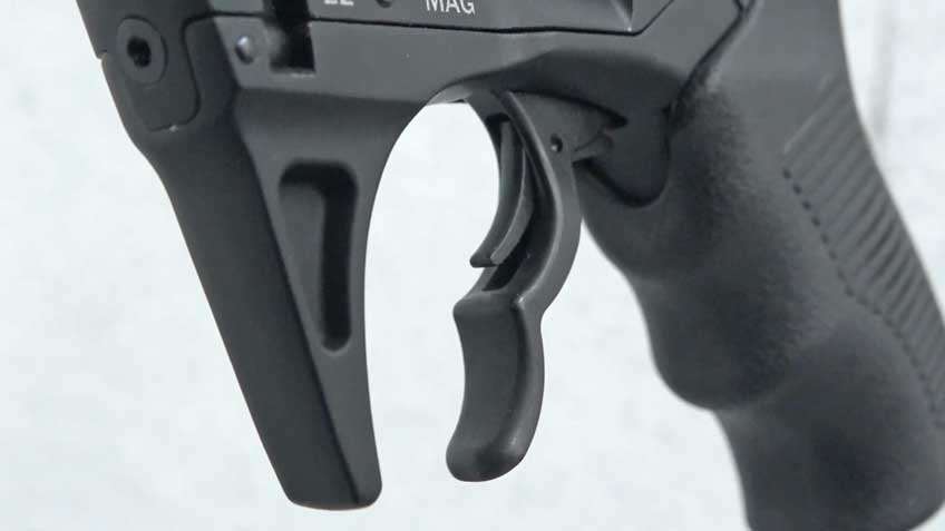 A cylinder release is found on the left side of the frame and the cylinder was noted to swing out freely. Topping the eight-shot revolver are a set of aiming reference marks. Our testers found the gun’s grooved polymer stock and frame design to point instinctively on target and recoil was noted to be minimal. Company literature states the barrels are regulated for 40-grain loads from CCI and PMC and that variations in other ammunition can cause problems with accuracy.
