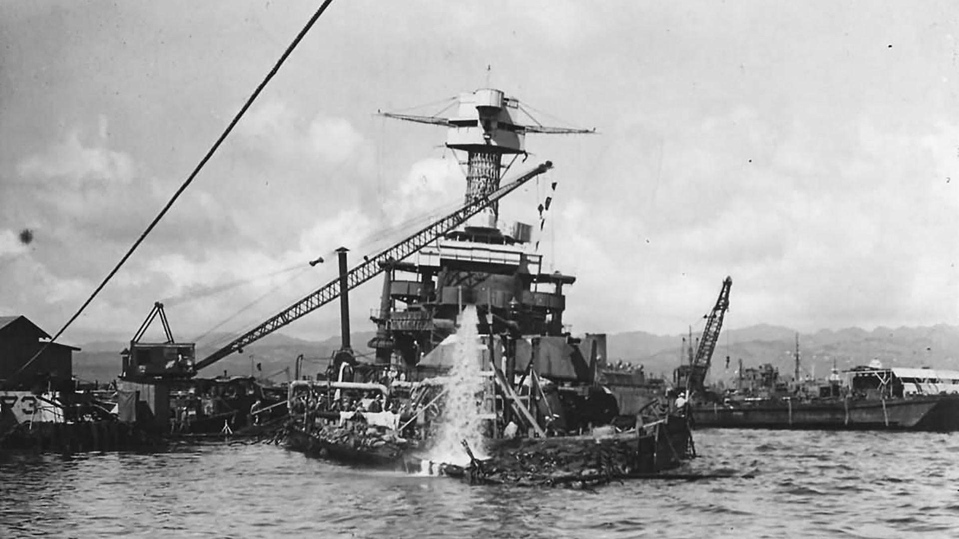 A photo of salvage operations underway on the wreck of U.S.S. California after the attack. Note how low the main deck is in the water, along with the water being pumped out of the hull. As the U.S.S. California settled onto bottom of Pearl Harbor, the hull began to sink down ever deeper into a silt embankment, necessitating the removal of usable materials and extra weight from the ship. This included the removal of the ship's 14" naval guns, which are already missing from the turrets in this photo.
