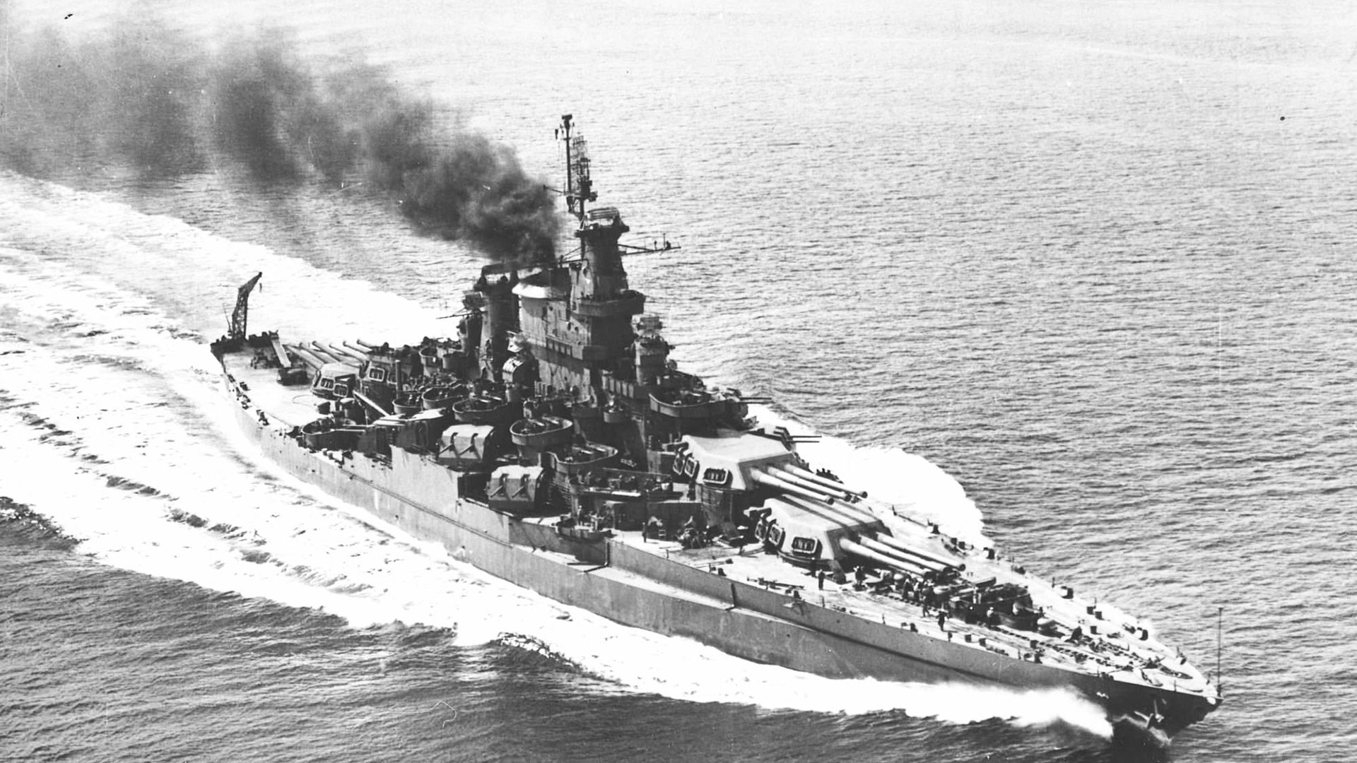 The U.S.S. California underway in 1944 after her extensive repairs and rebuild at Puget Sound Naval Yard, Wash. Note the redesigned superstructure, added radars and anti-aircraft mounts.