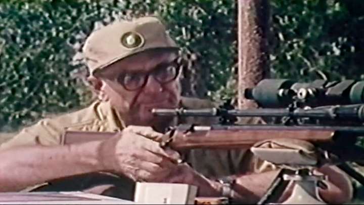 Vintage image of man shooting wood-stocked rifle with scope at a shooting bench.